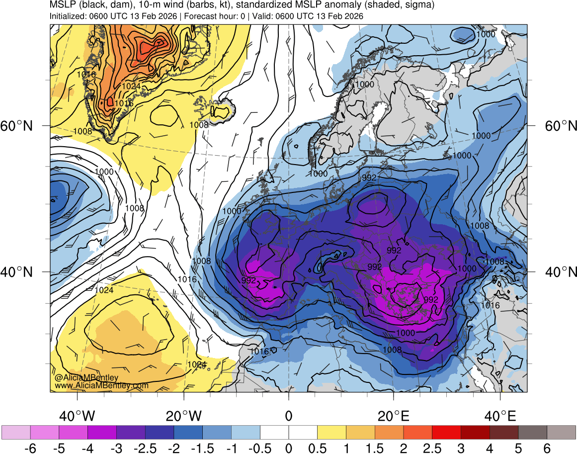* Χάρτης ατμοσφαιρικής πίεσης στις 13 Φεβρουαρίου. Οι μωβ και μπλε αποχρώσεις δείχνουν περιοχές όπου η πίεση ήταν πολύ χαμηλότερη από το συνηθισμένο για την εποχή, με επίκεντρο την Ελλάδα. Όσο πιο έντονο το μωβ χρώμα, τόσο πιο ακραία ιστορικά (1991-2020) η πτώση της πίεσης. Οι κίτρινες και πορτοκαλί αποχρώσεις δείχνουν περιοχές με υψηλότερη από τη μέση πίεση. Το εξαιρετικά βαθύ βαρομετρικό χαμηλό συνέβαλε στην προσωρινή άνοδο της στάθμης της θάλασσας και στις υπερχειλίσεις σε παράκτιες περιοχές.
