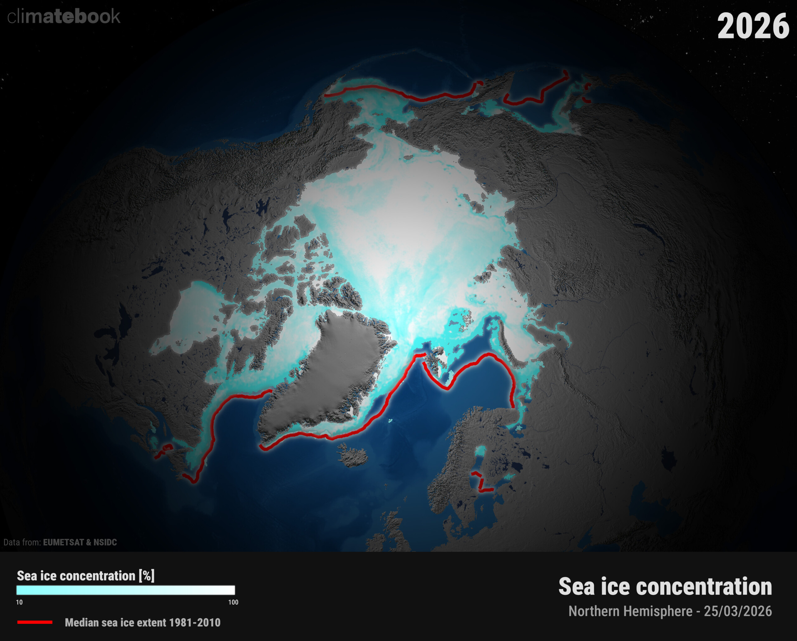 Εικόνα 1. Ημερήσια συγκέντρωση θαλάσσιου πάγου στην Αρκτική στις 25/03/2026. Πηγή δεδομένων: EUMETSAT & NSIDC. Επεξεργασία & οπτικοποίηση δεδομένων: climatebook.gr.