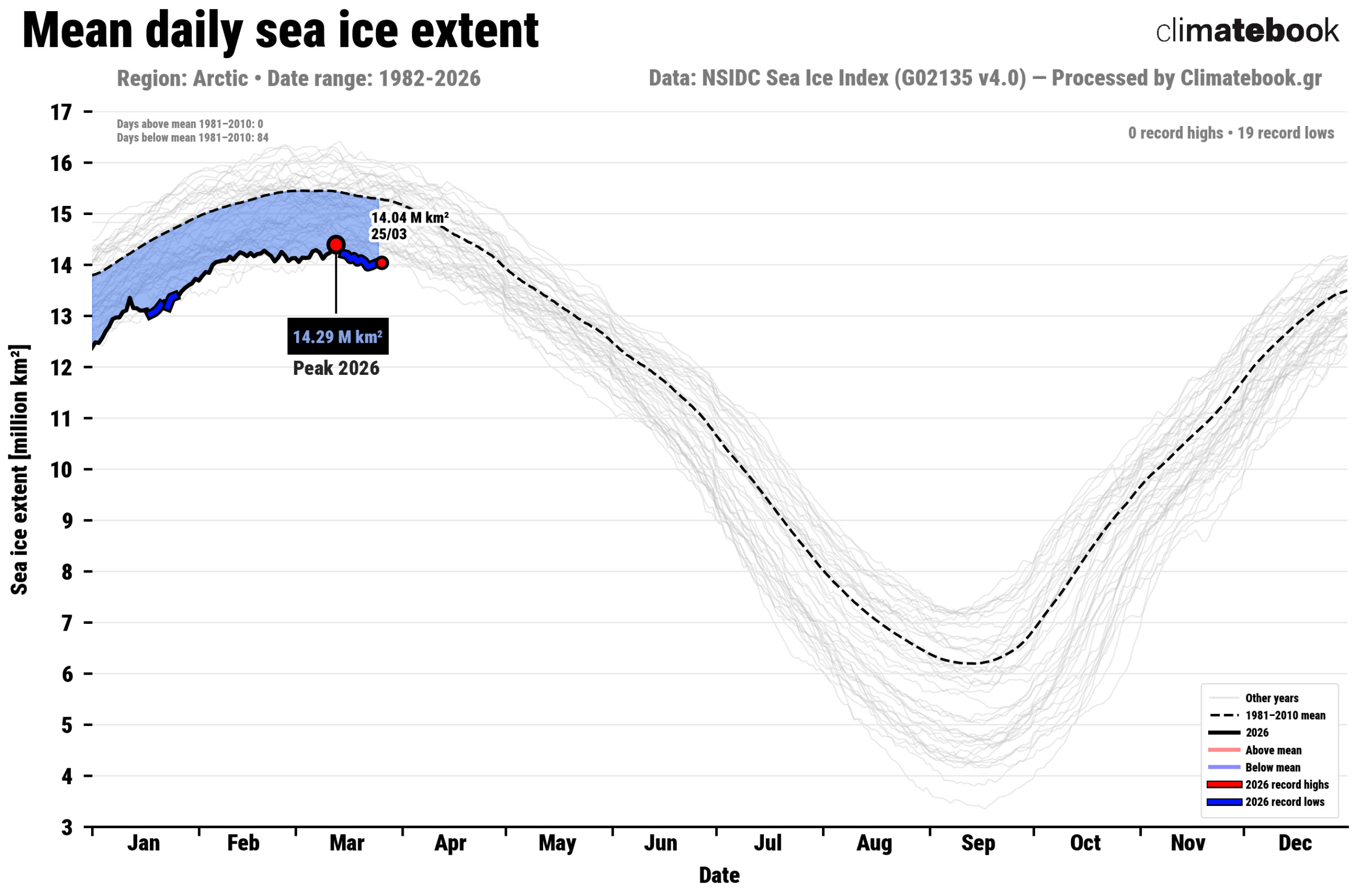 Με βάση την ανάλυση του Climatebook, η ημερήσια εξέλιξη της παγοκάλυψης το 2026 κινείται σταθερά στο κατώτερο εύρος της ιστορικής κατανομής, ενώ καταγράφονται επαναλαμβανόμενες ημερήσιες τιμές κοντά σε ιστορικά χαμηλά. Η τιμή των ~14.04 εκατ. km² στα τέλη Μαρτίου επιβεβαιώνει τη σημαντική αρνητική απόκλιση σε σχέση με τον κλιματικό μέσο όρο. .