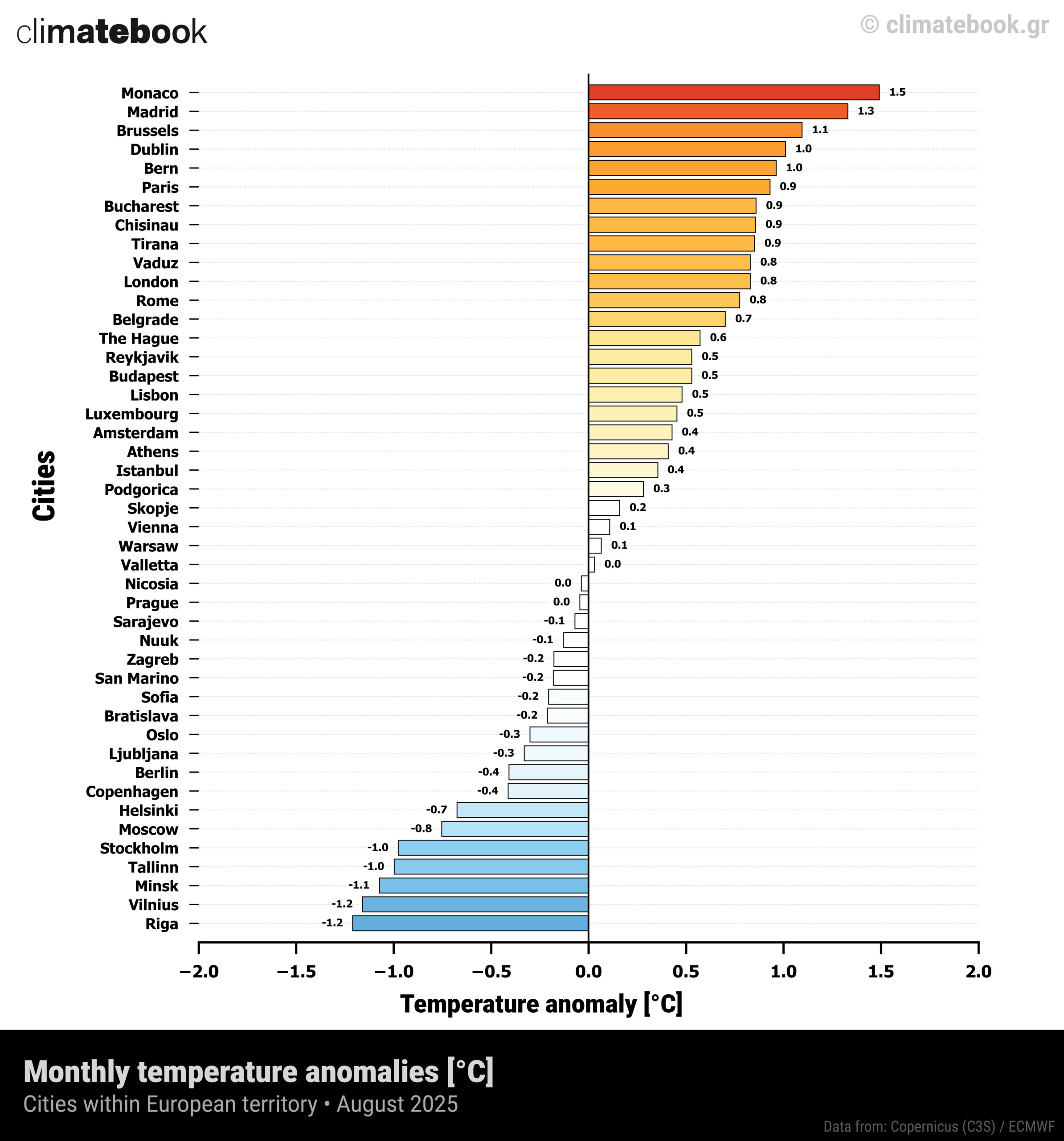 Εικόνα 2. Αποκλίσεις της θερμοκρασίας του αέρα σε πόλεις στην Ευρωπαϊκή Ήπειρο για τον Αύγουστο 2025. Πηγή δεδομένων: ERA-5 / Copernicus • C3S. Επεξεργασία & Οπτικοποίηση δεδομένων: Climatebook.