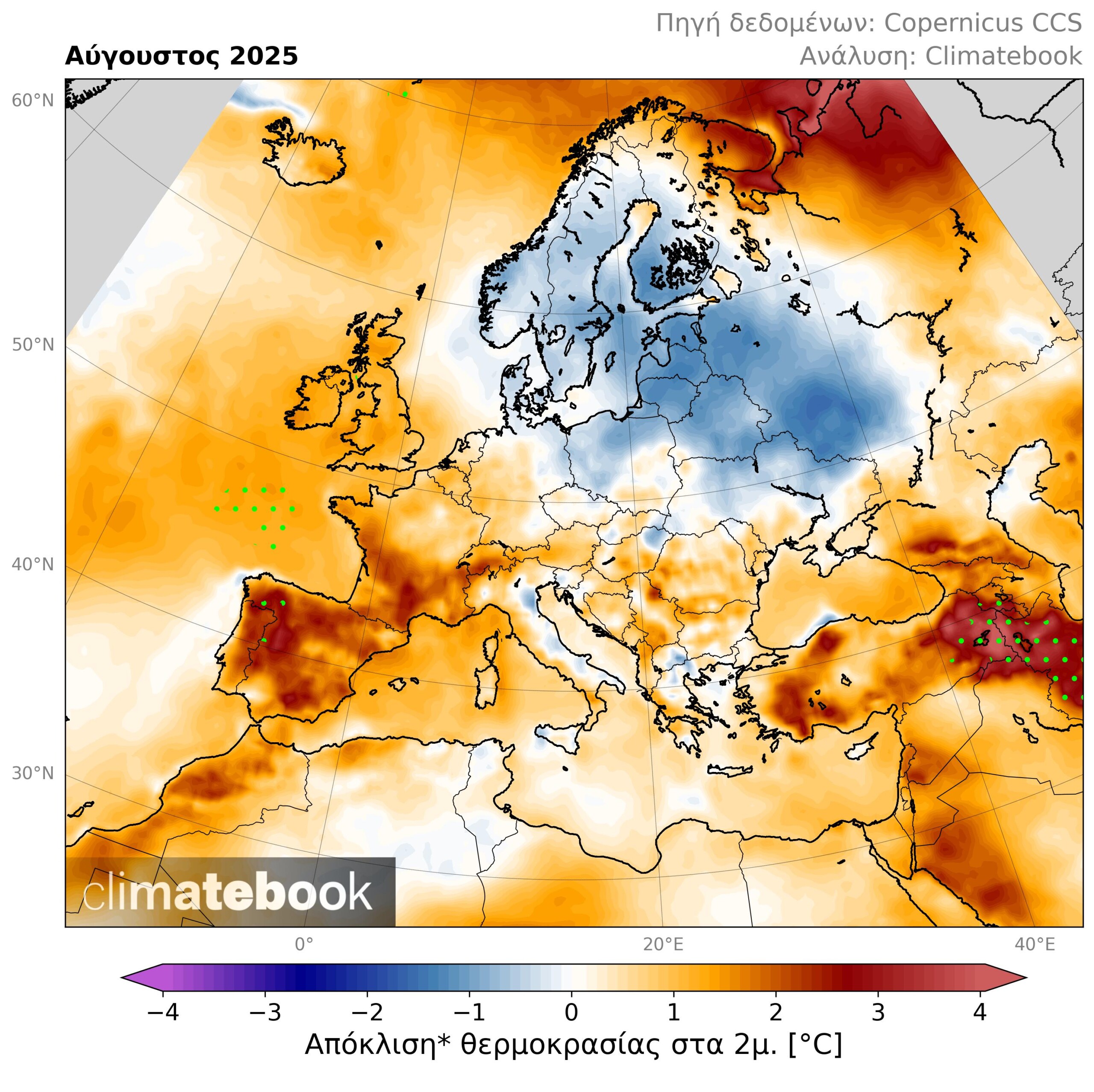 Εικόνα 1. Απόκλιση θερμοκρασίας στα 2 μέτρα για τον Αύγουστο του 2025 από την μέση τιμή της περιόδου 1991-2020. Πηγή δεδομένων: ERA-5 / Copernicus C3S. Επεξεργασία & Οπτικοποίηση δεδομένων: Climatebook.