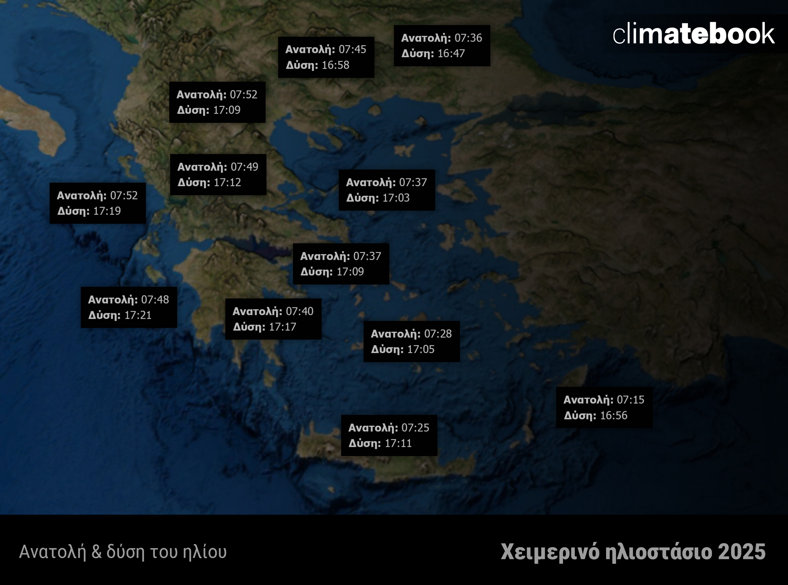 Στον παρακάτω χάρτη παρουσιάζονται ενδεικτικά οι ώρες της ανατολής και δύσης του ηλίου σε επιλεγμένα σημεία ανα την επικράτεια στην Ελλάδα για τις 21/12/2025