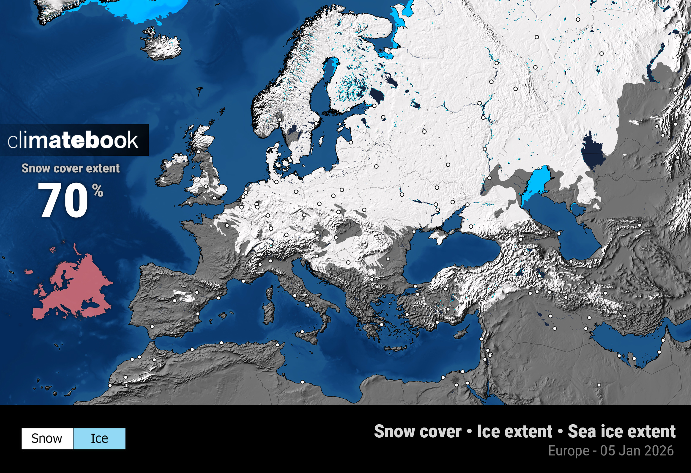 Η χιονοκάλυψη στην Ευρώπη στις αρχές Ιανουαρίου 2026 παρουσιάζεται εκτεταμένη, καλύπτοντας περίπου 7,8 εκατομμύρια τετραγωνικά χιλιόμετρα, δηλαδή σχεδόν το 70% της ευρωπαϊκής ηπείρου. Οι μεγαλύτερες εκτάσεις χιονιού εντοπίζονται στη Βόρεια, Κεντρική και Ανατολική Ευρώπη, με σχεδόν πλήρη κάλυψη στη Σκανδιναβία, τις χώρες της Βαλτικής, την Ανατολική Ευρώπη και μεγάλα τμήματα της Ρωσίας.