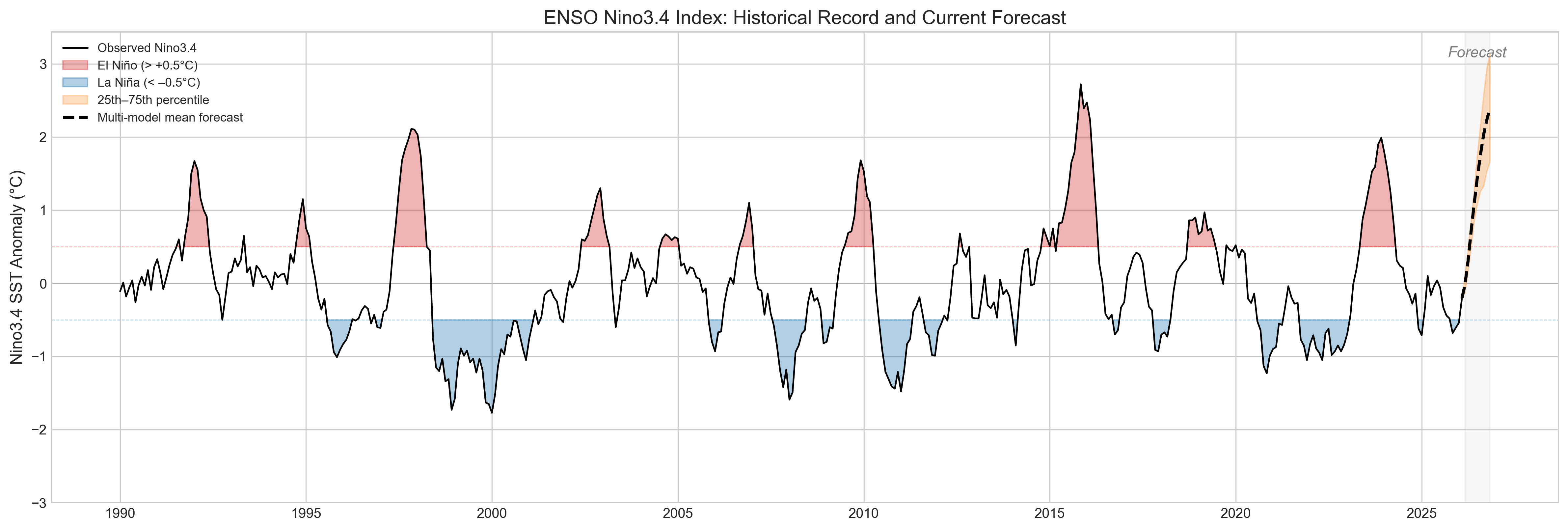 Τις τελευταίες ημέρες, η συζήτηση γύρω από το El Niño έχει φουντώσει ξανά. Αφορμή στάθηκε νέα ανάλυση του Climate Brink, σύμφωνα με την οποία αρκετά κλιματικά μοντέλα δείχνουν αυξημένη πιθανότητα να αναπτυχθεί ένα ισχυρό, ή ακόμη και πολύ ισχυρό, El Niño προς τα τέλη του 2026. Την ίδια ώρα, το αμερικανικό Climate Prediction Center εκτιμά ότι το El Niño είναι πιθανό να εμφανιστεί από το καλοκαίρι του 2026 και να συνεχιστεί έως το τέλος της χρονιάς, αλλά υπογραμμίζει ότι η έντασή του παραμένει αβέβαιη.