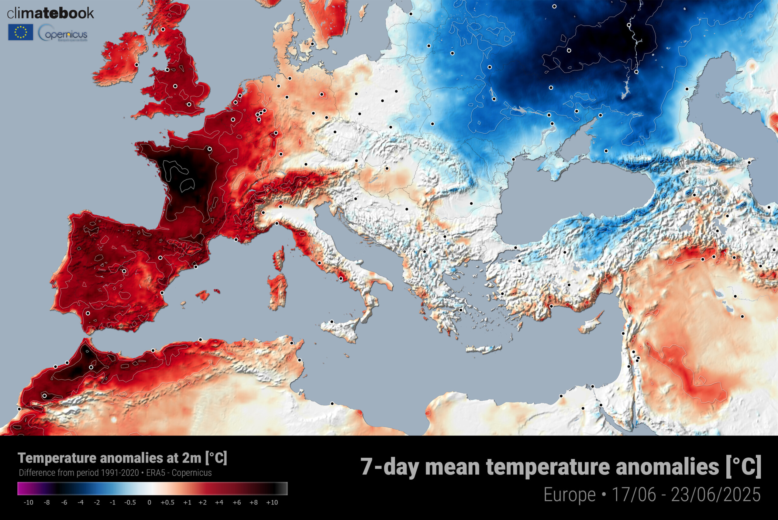 Τις επόμενες 7 ημέρες στην Ευρώπη αναμένονται σημαντικές θερμοκρασιακές διαφορές ανάμεσα σε Δυτική και Ανατολική Ευρώπη. Στη Δυτική Ευρώπη, ένα ισχυρό κύμα καύσωνα αναμένεται να προκαλέσει άνοδο των θερμοκρασιών κατά 8 έως 10 βαθμούς Κελσίου πάνω από τα κανονικά για την εποχή επίπεδα (περίοδος 1991-2020). Σε ορισμένες περιοχές, όπως η Γαλλία, η Ισπανία και η Πορτογαλία, οι θερμοκρασίες ενδέχεται να ξεπεράσουν τους 40°C, με πιθανότητα κατάρριψης ιστορικών ρεκόρ.