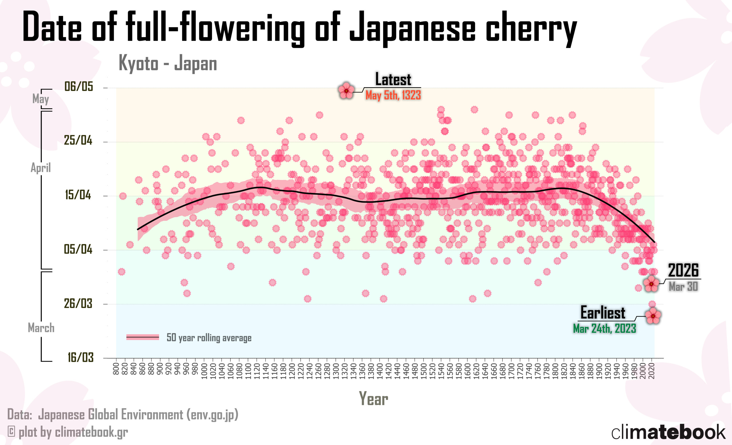 Στο γράφημα που έχει ετοιμάσει το Climatebook.gr, παρουσιάζονται όλες οι καταγραφές έναρξης άνθισης στο Κιότο από το 812 μ.Χ. μέχρι σήμερα. Η καμπύλη του κυλιόμενου μέσου όρου 50 ετών αποτυπώνει ξεκάθαρα τη μετατόπιση της ανθοφορίας προς τον Μάρτιο, ειδικά μετά τον 20ό αιώνα. Το 2026 συγκαταλέγεται στα 5–6 πιο πρώιμα έτη, συνεχίζοντας την τάση μετατόπισης της άνθισης.
