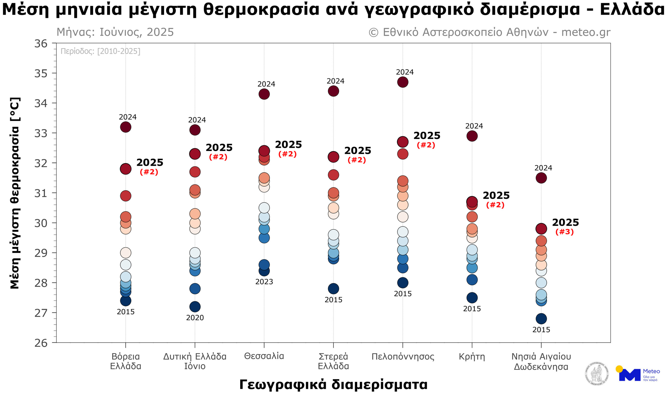 Εικόνα 1. Κατάταξη του μήνα Ιουνίου ανά έτος, ανάλογα με τη μέση μηνιαία τιμή της μέγιστης θερμοκρασίας από το 2010 έως 2025. Πηγή εικόνας: https://meteo.gr/article_view.cfm?entryID=3757.
