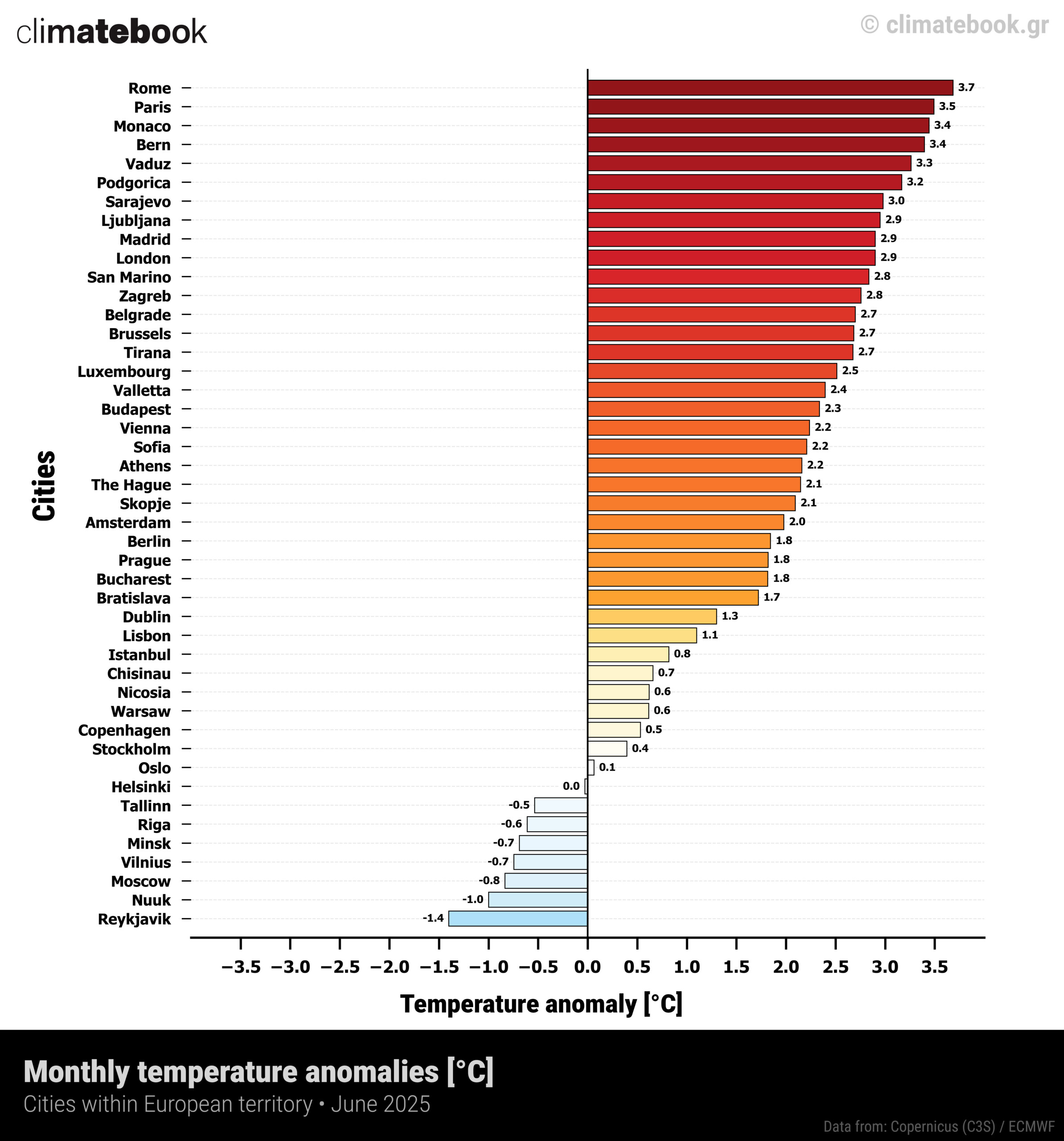 Εικόνα 2. Αποκλίσεις της θερμοκρασίας του αέρα σε πόλεις στην Ευρωπαϊκή Ήπειρο για τον Ιούνιο 2025. Πηγή δεδομένων: ERA-5 / Copernicus • C3S. Επεξεργασία & Οπτικοποίηση δεδομένων: Climatebook.