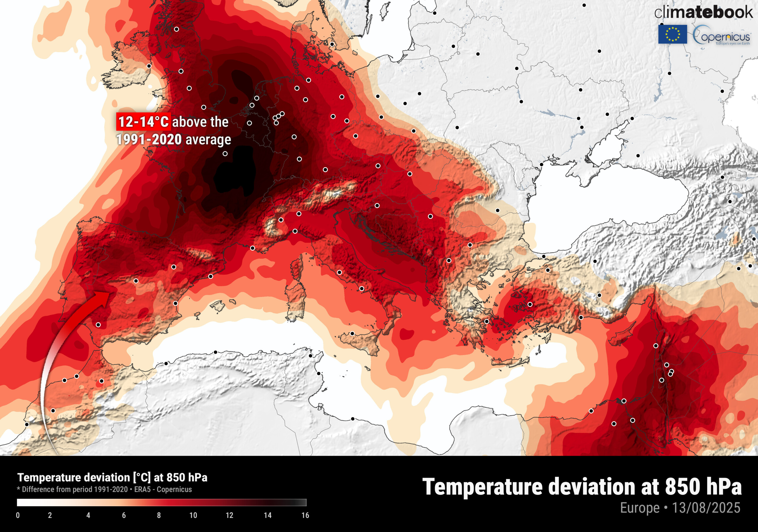 Εικόνα 1. Πρόγνωση θετικών αποκλίσεων της θερμοκρασίας στο επίπεδο των 850 hPa (περίπου 1500 μέτρα από την επιφάνεια) σε σχέση με τη μέση τιμή της περιόδου 1991-2020, για τις 13/08/2025. Πηγή δεδομένων: ERA5 – Copernicus / C3S. Επεξεργασία & οπτικοποίηση: climatebook.gr.