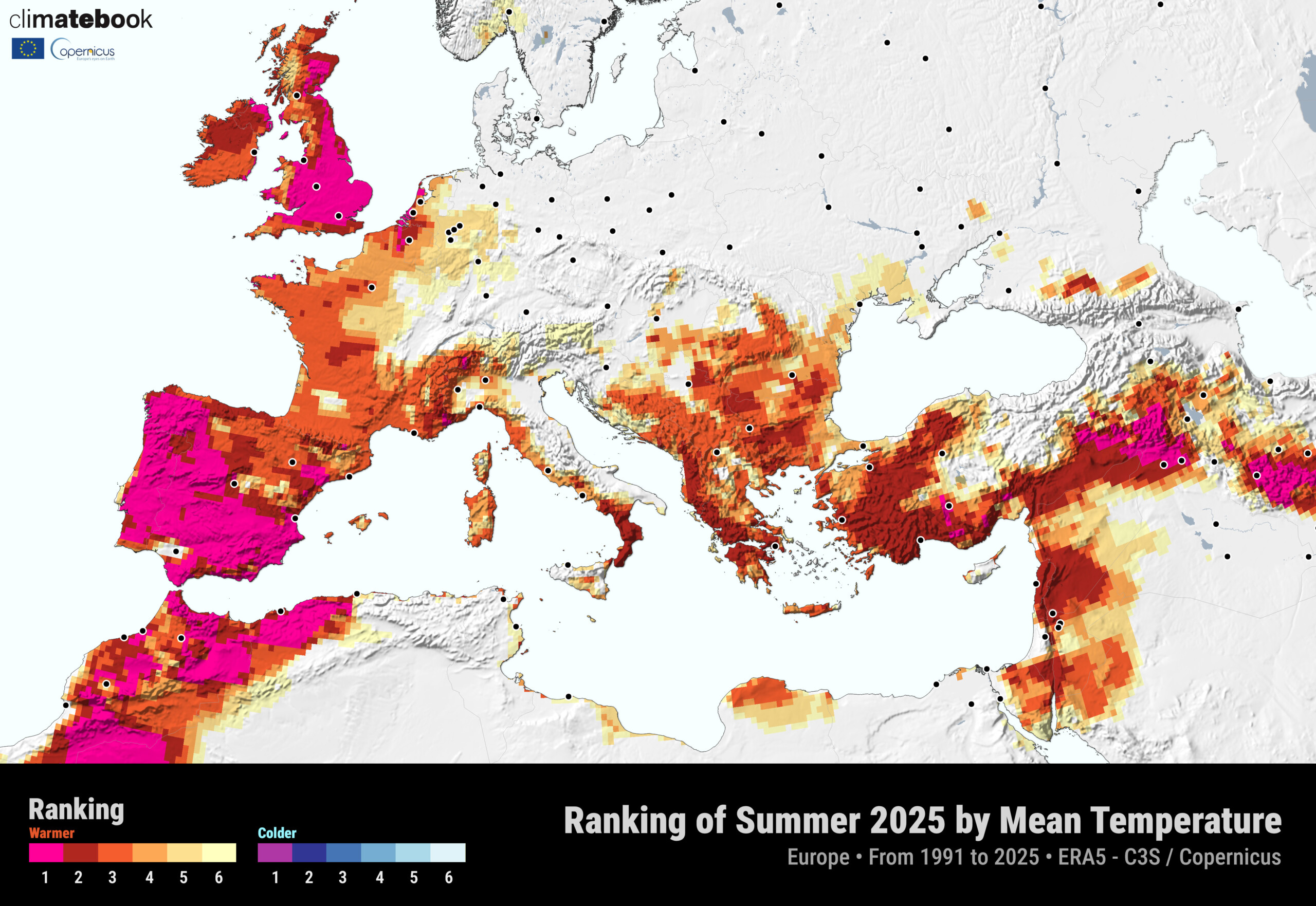 Εικόνα 1. Κατάταξη του καλοκαιριού 2025 (Ιούνιος, Ιούλιος, Αύγουστος) στην Ευρώπη με βάση την μέση θερμοκρασία του καλοκαιριού από το 1991. Πηγή δεδομένων: ERA-5 • C3S / Copernicus. Ανάλυση & οπτικοποίηση: climatebook.gr.