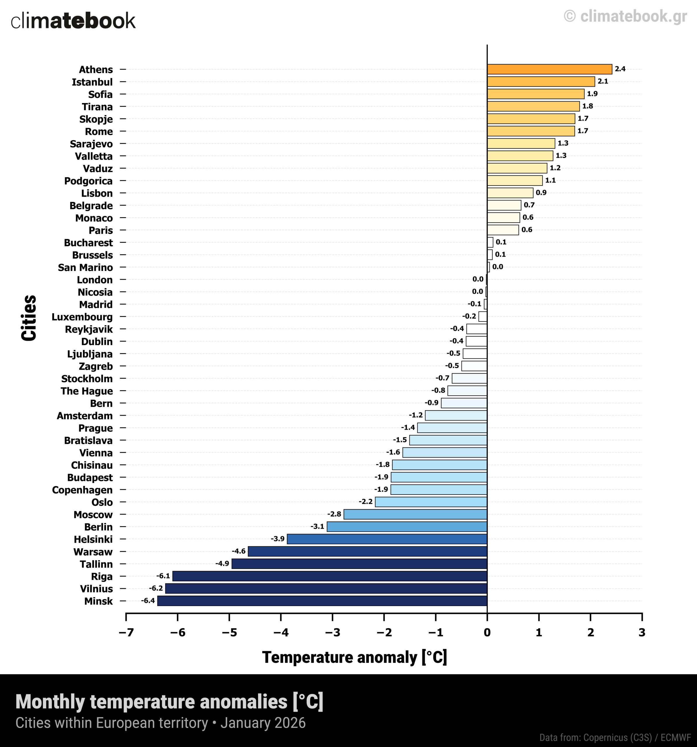 Εικόνα 3. Αποκλίσεις της θερμοκρασίας του αέρα σε πόλεις στην Ευρωπαϊκή ήπειρο για τον Ιανουάριο 2026. Πηγή δεδομένων: ERA-5 / Copernicus • C3S. Επεξεργασία & Οπτικοποίηση δεδομένων: Climatebook.