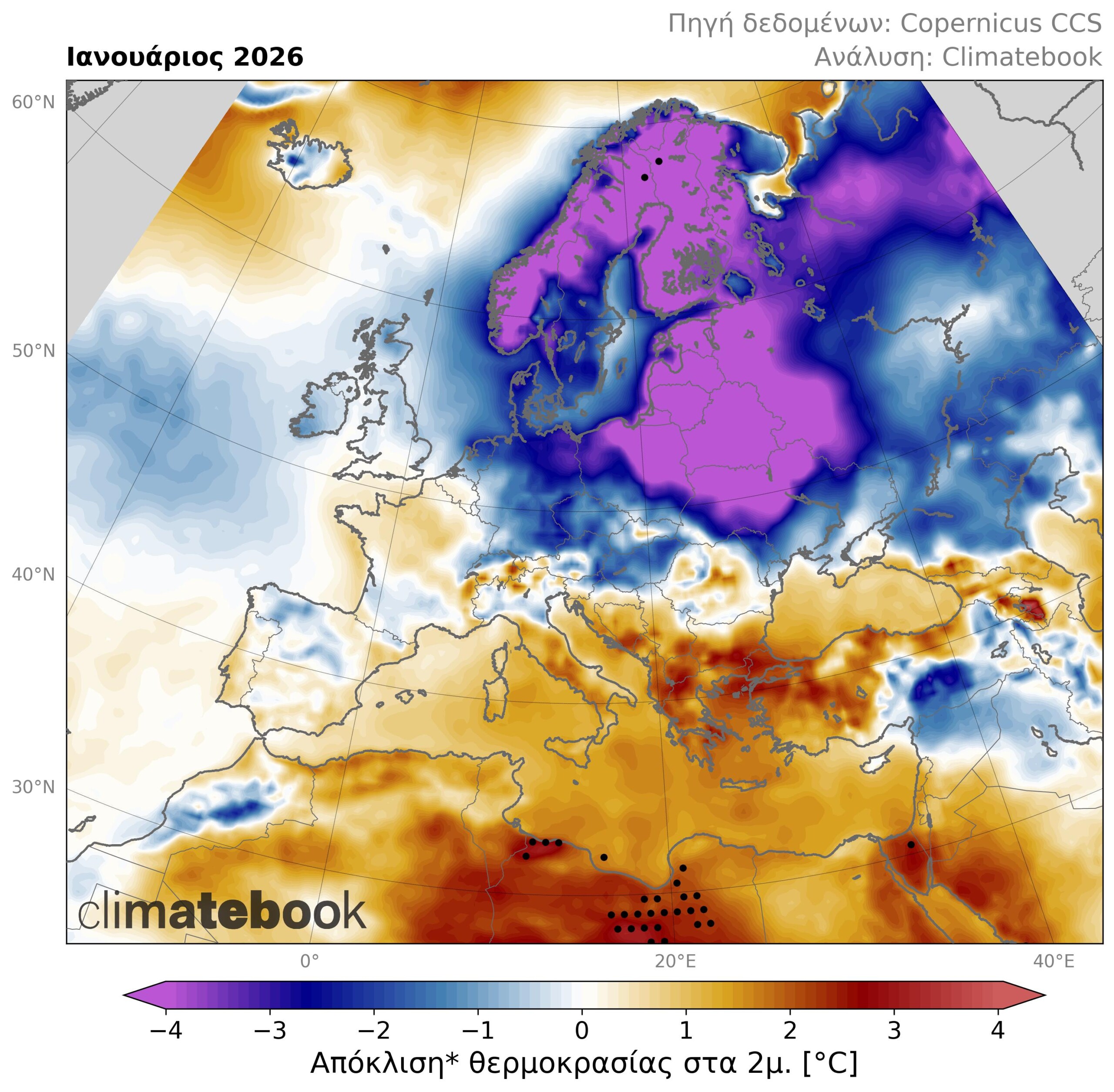 Εικόνα 1. Χάρτης απόκλισης της μέσης θερμοκρασίας αέρα (2 μέτρα από την επιφάνεια) κατά τον Ιανουάριο 2026 σε σχέση με τις μέσες τιμές της περιόδου 1991-2020. Οι μαύρες κουκκίδες υποδηλώνουν τις περιοχές όπου η απόκλιση αποτελεί θετικό ή αρνητικό ρεκόρ από το 1960 μέχρι σήμερα. Βάση δεδομένων: ERA5 (C3S/ECMWF).