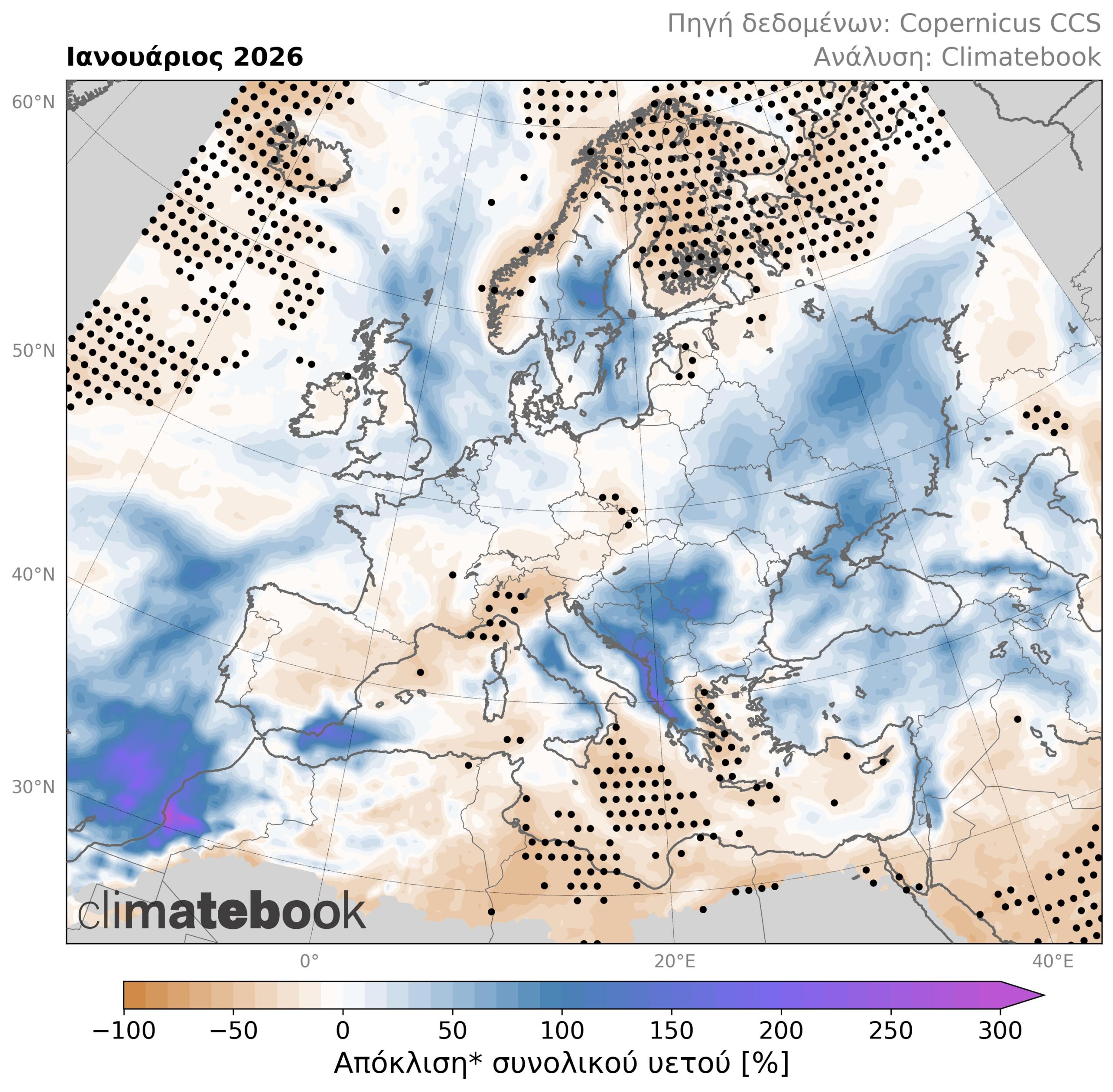 Εικόνα 2. Χάρτης ποσοστιαίας απόκλισης συνολικού μηνιαίου υετού κατά τον Ιανουάριο 2026 σε σχέση με τις μέσες τιμές της περιόδου 1991-2020. Με γκρι απεικονίζονται οι περιοχές με μέσο μηνιαίο υετό μικρότερο από 3 χιλιοστά. Οι μαύρες κουκκίδες υποδηλώνουν τις περιοχές όπου η απόκλιση αποτελεί θετικό ή αρνητικό ρεκόρ από το 1960 μέχρι σήμερα. Βάση δεδομένων: ERA5 (C3S/ECMWF).