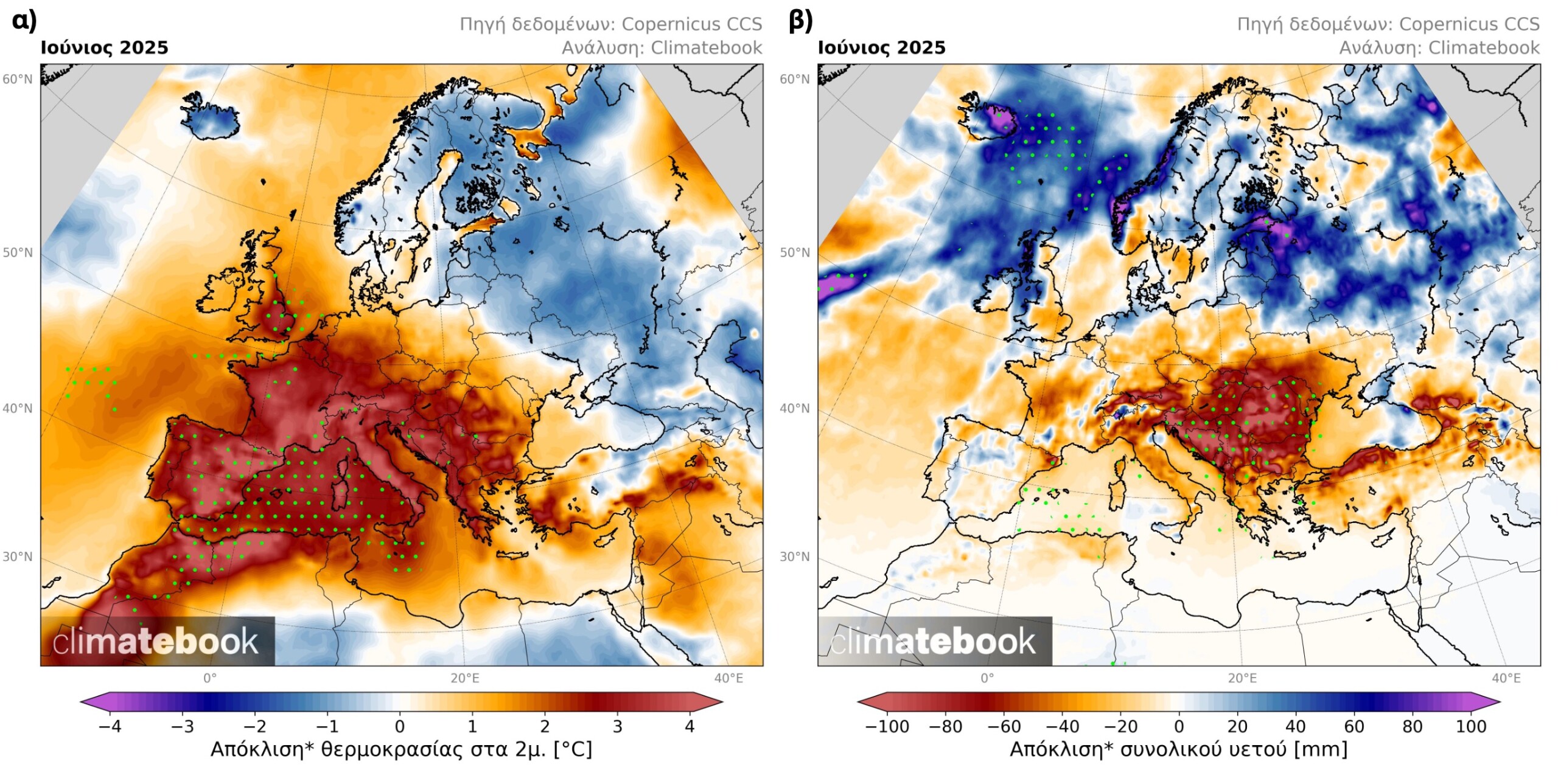 Η επιστημονική ομάδα του climatebook ανέλυσε τα δεδομένα θερμοκρασίας και υετού για όλη την Ευρώπη και υπολόγισε τις αποκλίσεις τους από τα κανονικά για την εποχή επίπεδα (Εικόνα 2). Στον 1ο χάρτη δείχνουμε την μέση μηνιαία απόκλιση της θερμοκρασίας στα 2 μέτρα από τις αντίστοιχες μέσες τιμές της περιόδου 1991-2020. Οι κόκκινες περιοχές αντιστοιχούν σε θετικές αποκλίσεις (θερμότερες συνθήκες από το κανονικό) και οι μπλε περιοχές αντιστοιχούν σε αρνητικές αποκλίσεις (ψυχρότερες συνθήκες από το κανονικό). Περιπτώσεις όπου αυτές οι αποκλίσεις αποτελούν ρεκόρ Ιουνίου για την περιοχή από το 1960 μέχρι σήμερα υποδεικνύονται με πράσινες κουκκίδες.
