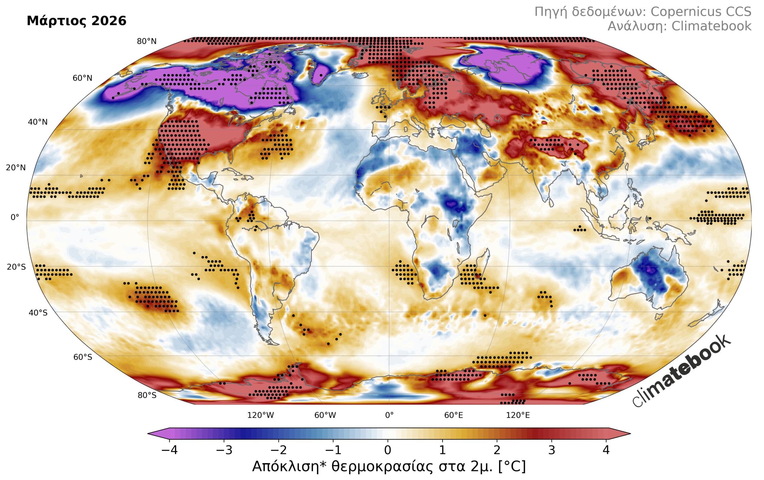 Εικόνα 1. Χάρτης απόκλισης της μέσης θερμοκρασίας αέρα (2 μέτρα από την επιφάνεια) κατά τον Μάρτιο 2026 σε σχέση με τις μέσες τιμές της περιόδου 1991-2020. Οι μαύρες κουκκίδες υποδηλώνουν τις περιοχές όπου η απόκλιση αποτελεί θετικό ή αρνητικό ρεκόρ από το 1960 μέχρι σήμερα. Βάση δεδομένων: ERA5 (C3S/ECMWF).