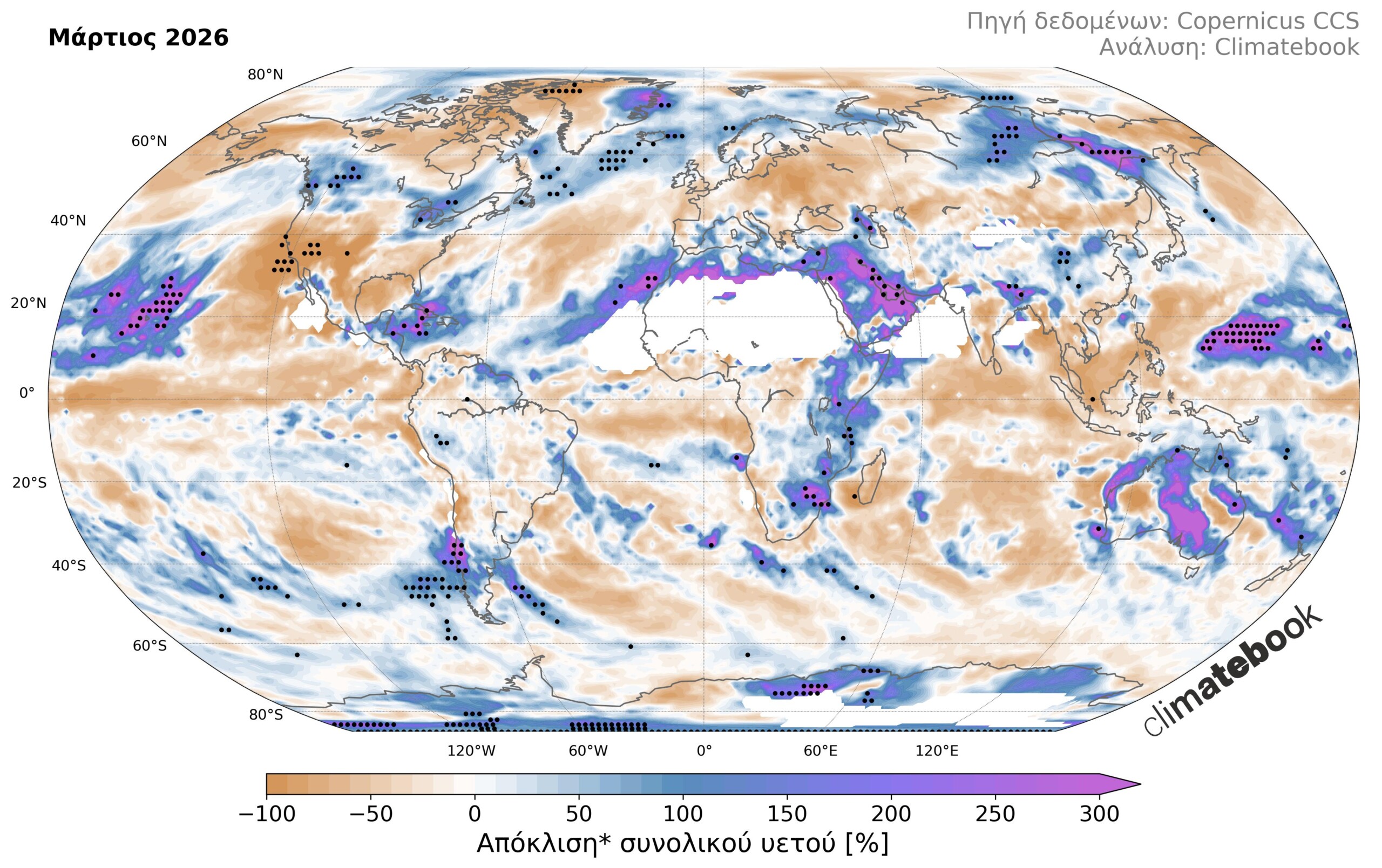 Εικόνα 2. Χάρτης ποσοστιαίας απόκλισης συνολικού μηνιαίου υετού κατά τον Μάρτιο 2026 σε σχέση με τις μέσες τιμές της περιόδου 1991-2020. Με άσπρο απεικονίζονται οι περιοχές με μέσο μηνιαίο υετό μικρότερο από 3 χιλιοστά. Οι μαύρες κουκκίδες υποδηλώνουν τις περιοχές όπου η απόκλιση αποτελεί θετικό ή αρνητικό ρεκόρ από το 1960 μέχρι σήμερα. Βάση δεδομένων: ERA5 (C3S/ECMWF).