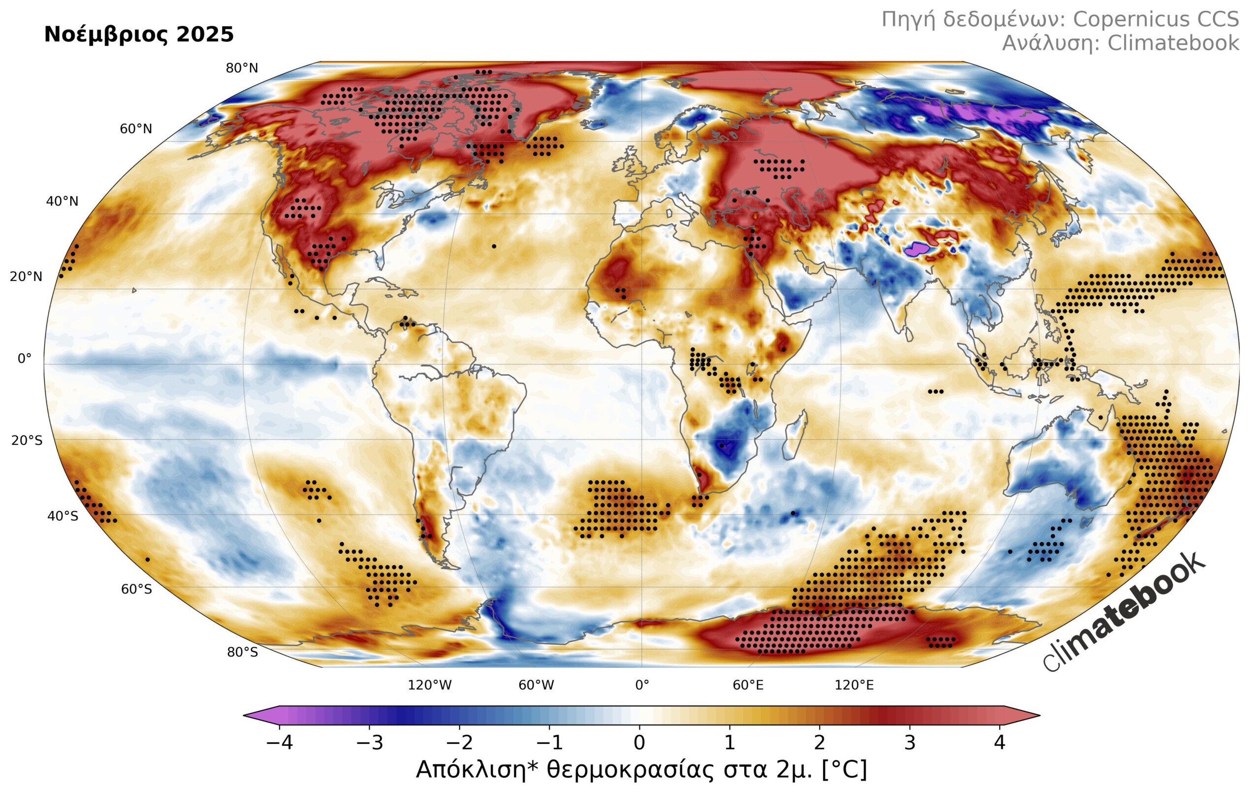 Σύμφωνα με τα τελευταία δεδομένα της αρμόδιας υπηρεσίας της Ευρωπαϊκής Ένωσης, Copernicus Climate Change Service, ο Νοέμβριος του 2025 καταγράφηκε σε παγκόσμιο επίπεδο ως ο 3ος θερμότερος Νοέμβριος από το 1960 (τουλάχιστον) μέχρι σήμερα. Η μέση θερμοκρασία αέρα ήταν 0.65°C πάνω από τον μέσο όρο της περιόδου 1991-2020 και 1.54°C πάνω από τα προ-βιομηχανικά επίπεδα (1850-1900). Χαρακτηριστικό της απότομης υπερθέρμανσης του πλανήτη κατά τις τελευταίες δεκαετίες είναι ότι τα τελευταία 11 χρόνια έχουμε βιώσει τους 10 θερμότερους Νοέμβριους από το 1960 μέχρι σήμερα.
