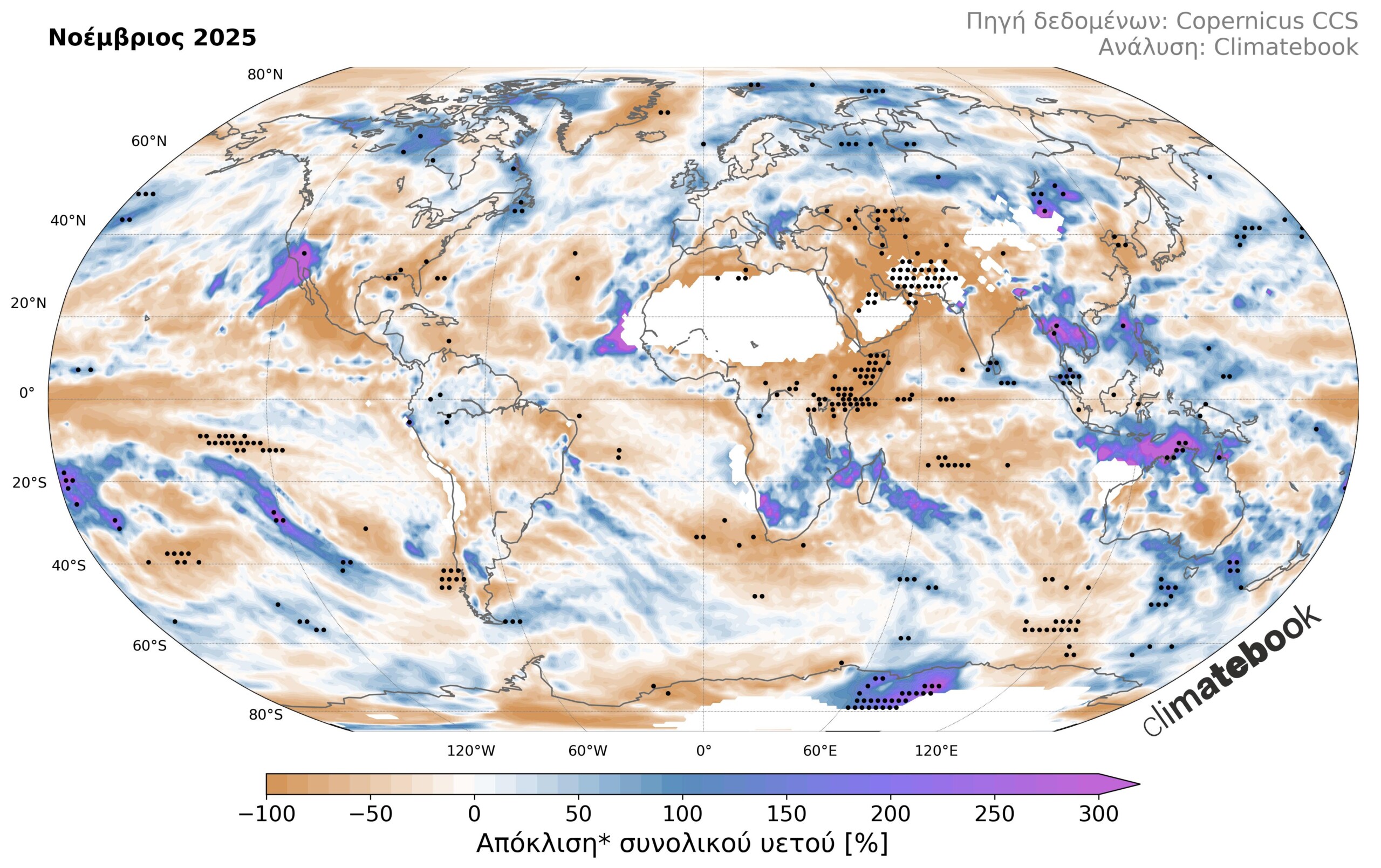 Εικόνα 2. Χάρτης ποσοστιαίας απόκλισης συνολικού μηνιαίου υετού κατά τον Νοέμβριο 2025 σε σχέση με τις μέσες τιμές της περιόδου 1991-2020. Με άσπρο απεικονίζονται οι περιοχές με μέσο μηνιαίο υετό μικρότερο από 3 χιλιοστά. Οι μαύρες κουκκίδες υποδηλώνουν τις περιοχές όπου η απόκλιση αποτελεί θετικό ή αρνητικό ρεκόρ από το 1960 μέχρι σήμερα. Βάση δεδομένων: ERA5 (C3S/ECMWF).