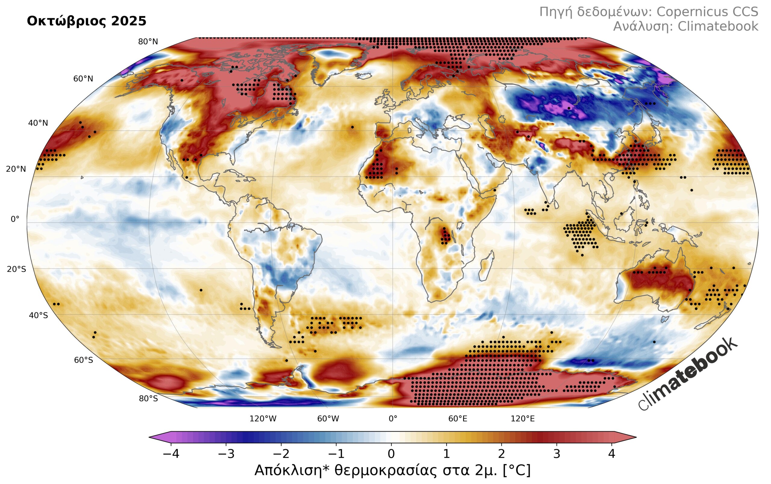 Εικόνα 1. Χάρτης απόκλισης της μέσης θερμοκρασίας αέρα (2 μέτρα από την επιφάνεια) κατά τον Οκτώβριο 2025 σε σχέση με τις μέσες τιμές της περιόδου 1991-2020. Οι μαύρες κουκκίδες υποδηλώνουν τις περιοχές όπου η απόκλιση αποτελεί θετικό ή αρνητικό ρεκόρ από το 1960 μέχρι σήμερα. Βάση δεδομένων: ERA5 (C3S/ECMWF)