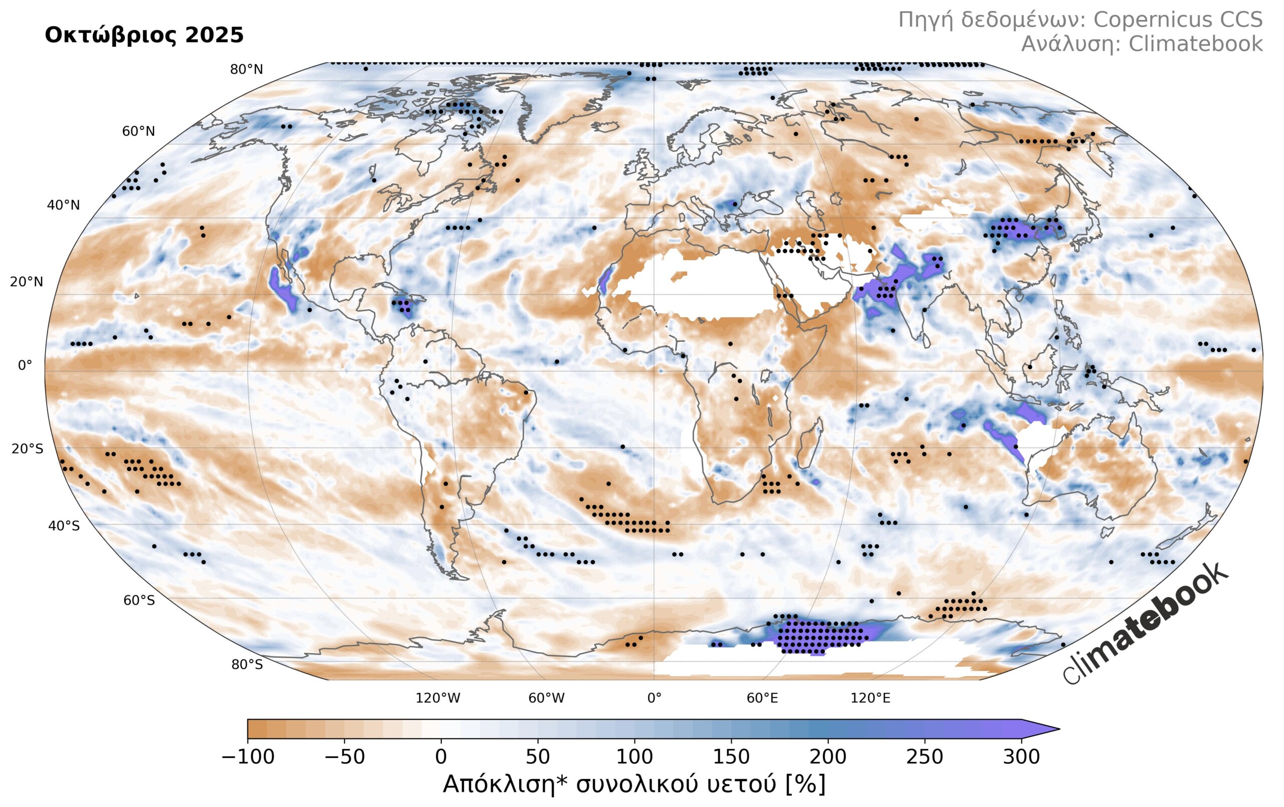 Εικόνα 2. Χάρτης ποσοστιαίας απόκλισης συνολικού μηνιαίου υετού κατά τον Οκτώβριο 2025 σε σχέση με τις μέσες τιμές της περιόδου 1991-2020. Με άσπρο απεικονίζονται οι περιοχές με μέσο μηνιαίο υετό μικρότερο από 3 χιλιοστά. Οι μαύρες κουκκίδες υποδηλώνουν τις περιοχές όπου η απόκλιση αποτελεί θετικό ή αρνητικό ρεκόρ από το 1960 μέχρι σήμερα. Βάση δεδομένων: ERA5 (C3S/ECMWF)