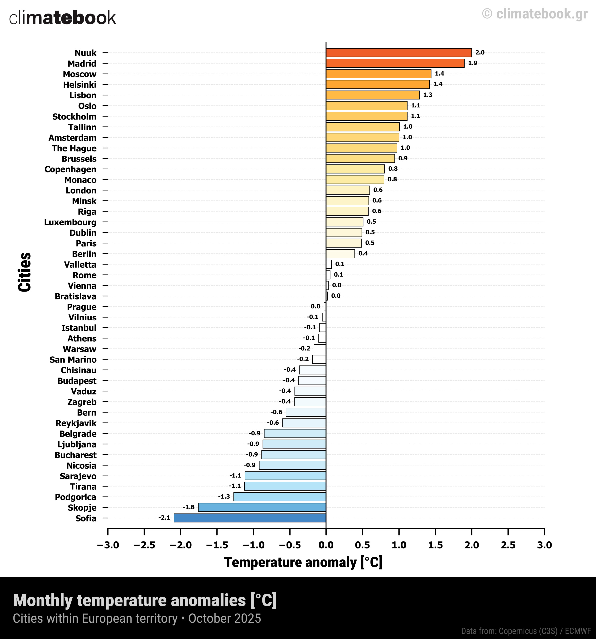 Εικόνα 3. Αποκλίσεις της θερμοκρασίας του αέρα σε πόλεις στην Ευρωπαϊκή ήπειρο για τον Οκτώβριο 2025. Πηγή δεδομένων: ERA-5 / Copernicus • C3S. Επεξεργασία & Οπτικοποίηση δεδομένων: Climatebook.