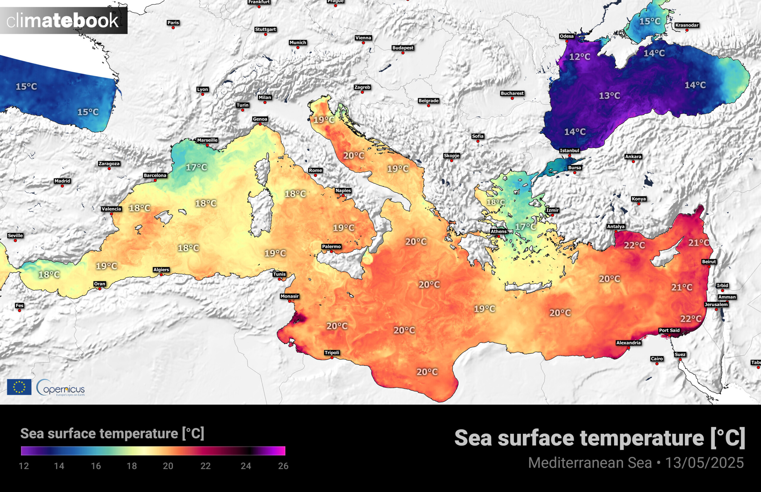 Η θερμοκρασία της επιφάνειας της θάλασσας στη Μεσόγειο κυμαίνεται από 18 έως 22°C. Οι υψηλότερες θερμοκρασίες σύμφωνα με τα δορυφορικά δεδομένα του Marine / Copernicus παρατηρούνται στην Ανατολική Μεσόγειο και ειδικότερα στη Θάλασσα του Λεβάντε.
