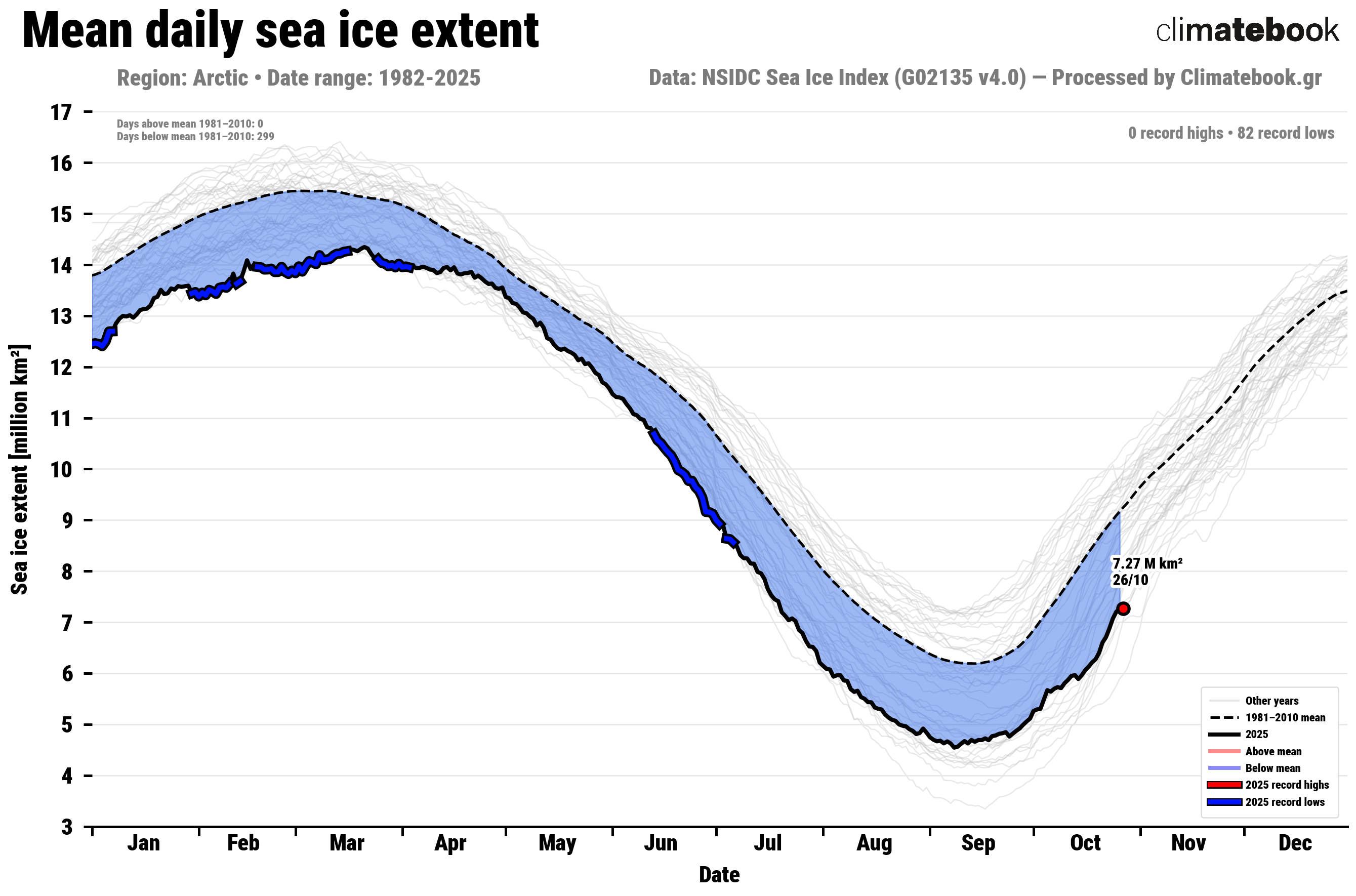 Εικόνα 1. Μέση ημερήσια έκταση θαλάσσιου πάγου στην Αρκτική από το 1982 έως το 2025. Πηγή δεδομένων: NSIDC. Επεξεργασία & οπτικοποίηση δεδομένων: climatebook.gr.