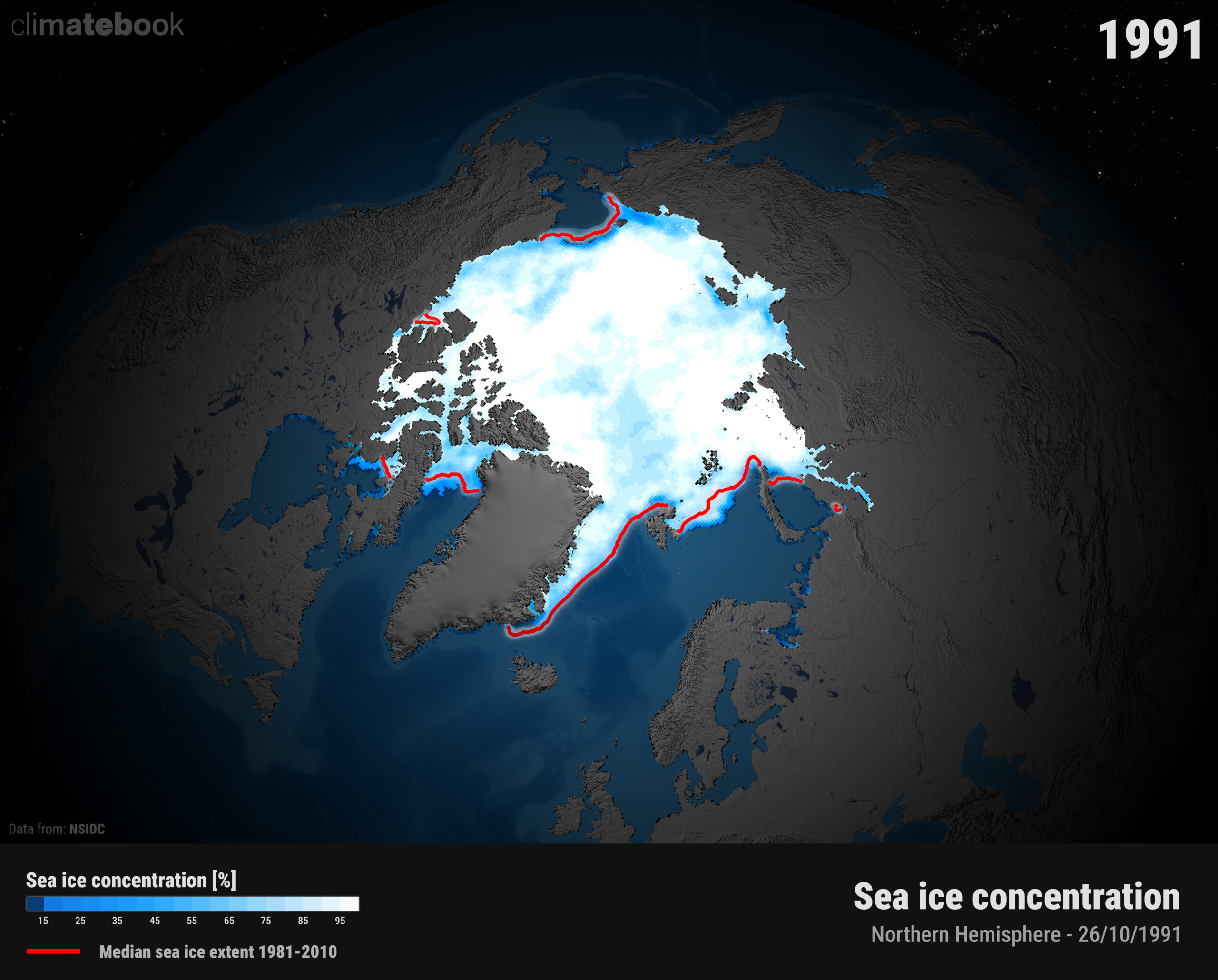Εικόνα 3. Ημερήσια συγκέντρωση θαλάσσιου πάγου στην Αρκτική στις 26/10/1991. Πηγή δεδομένων: NSIDC. Επεξεργασία & οπτικοποίηση δεδομένων: climatebook.gr.