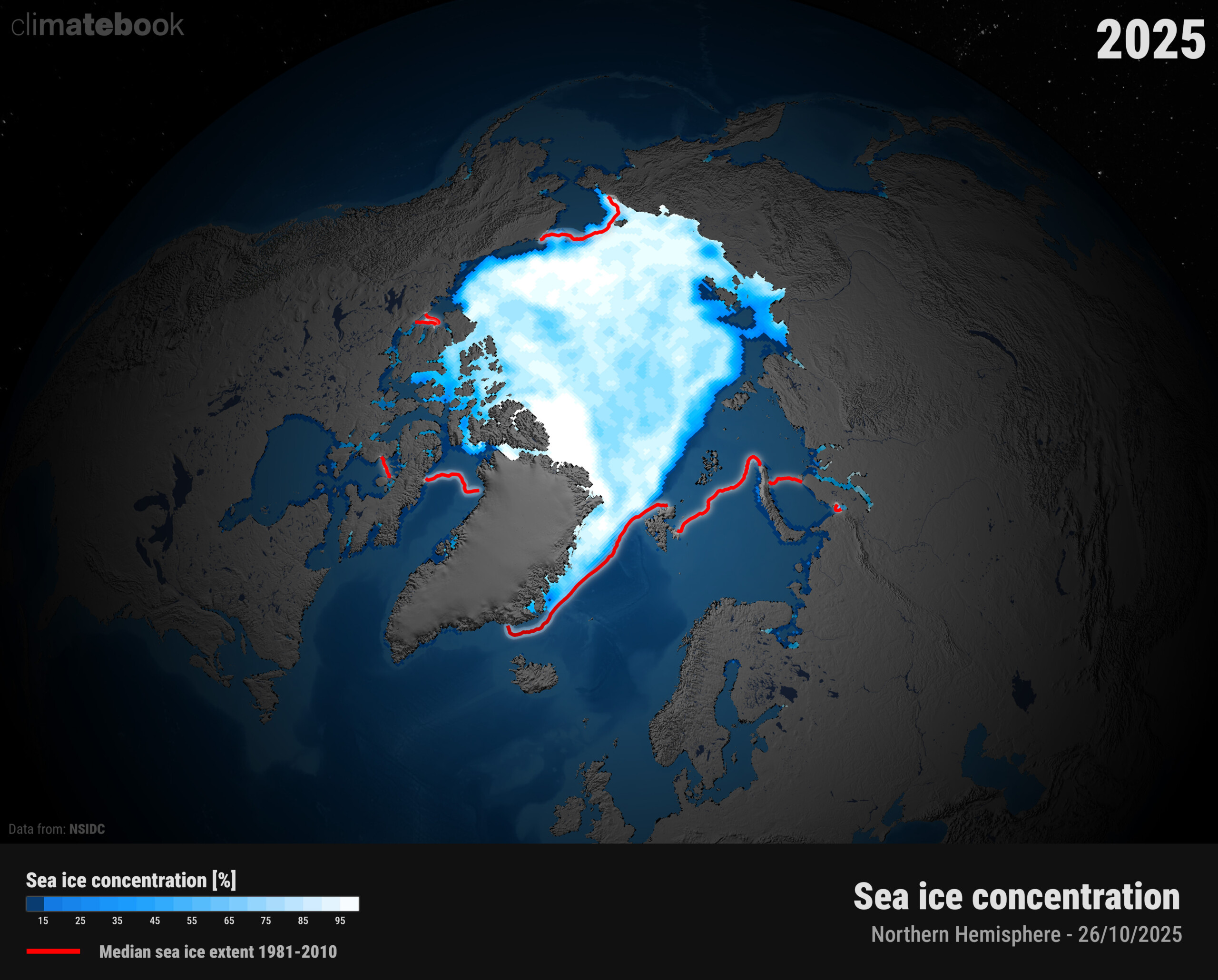 Εικόνα 2. Ημερήσια συγκέντρωση θαλάσσιου πάγου στην Αρκτική στις 26/10/2025. Πηγή δεδομένων: NSIDC. Επεξεργασία & οπτικοποίηση δεδομένων: climatebook.gr.
