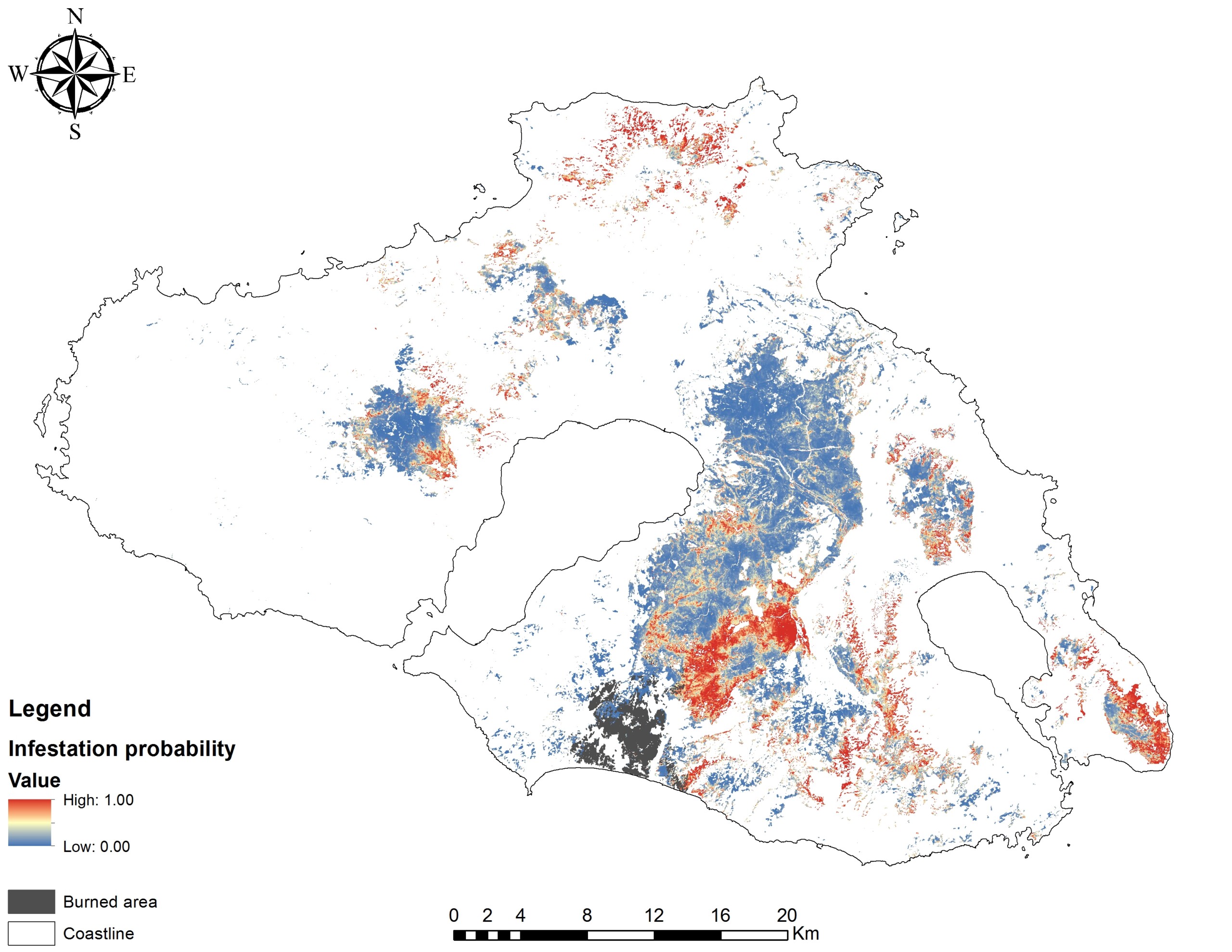 Πιθανότητας εντομογενούς θνησιμότητας δέντρων στα πευκοδάση της Λέσβου. Οι θερμότερες χρωματικές αποχρώσεις υποδηλώνουν υψηλότερο προβλεπόμενο κίνδυνο θνησιμότητας, ενώ οι ψυχρότερες αποχρώσεις αντιστοιχούν σε περιοχές χαμηλότερης ευπάθειας.