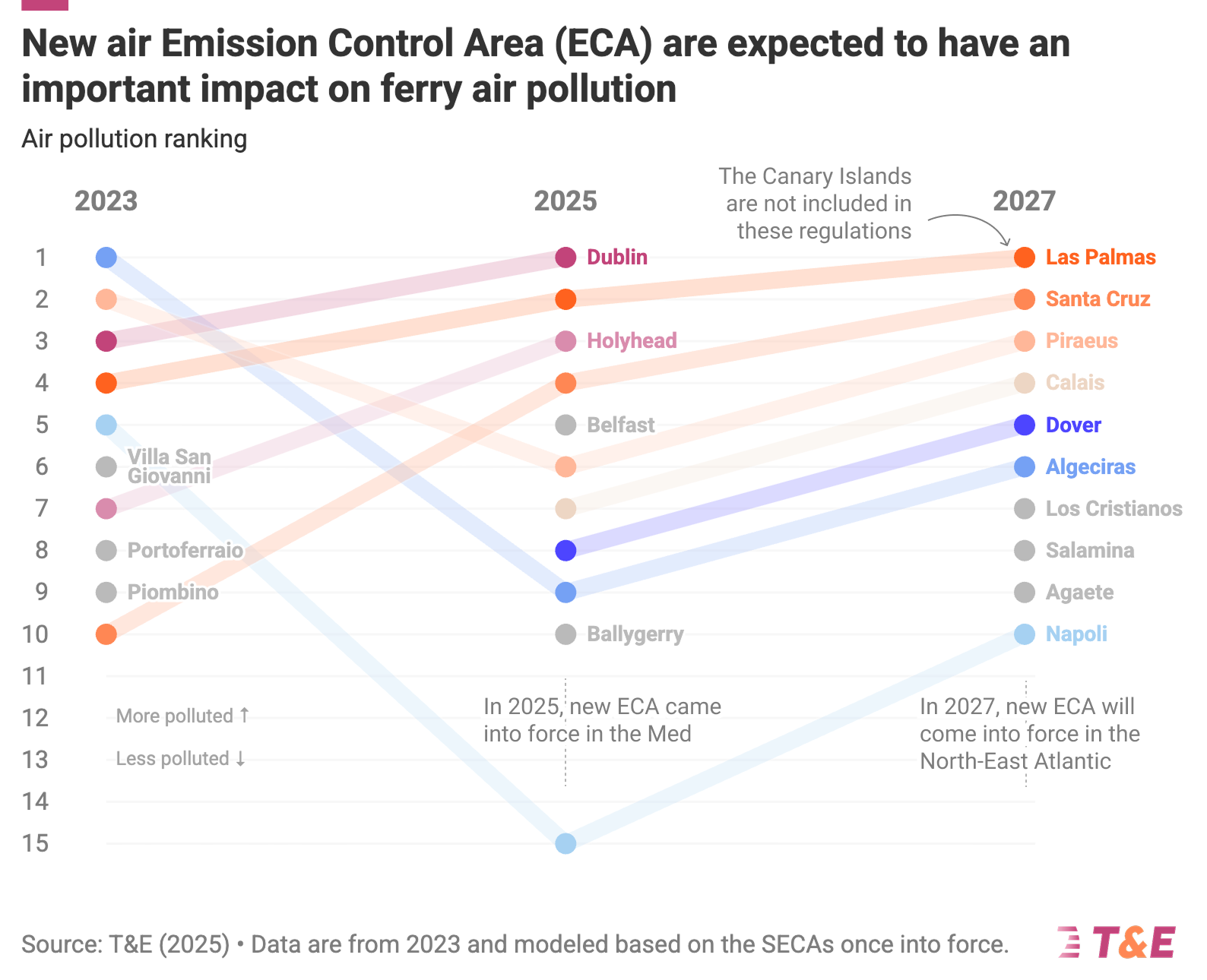 Σύμφωνα με την T&E, 1.043 ευρωπαϊκά ferries που αναλύθηκαν για το 2023 στην Ευρώπη εξέπεμψαν 13,4 εκατ. τόνους CO₂, ποσότητα που αντιστοιχεί στις ετήσιες εκπομπές 6,6 εκατομμυρίων αυτοκινήτων.