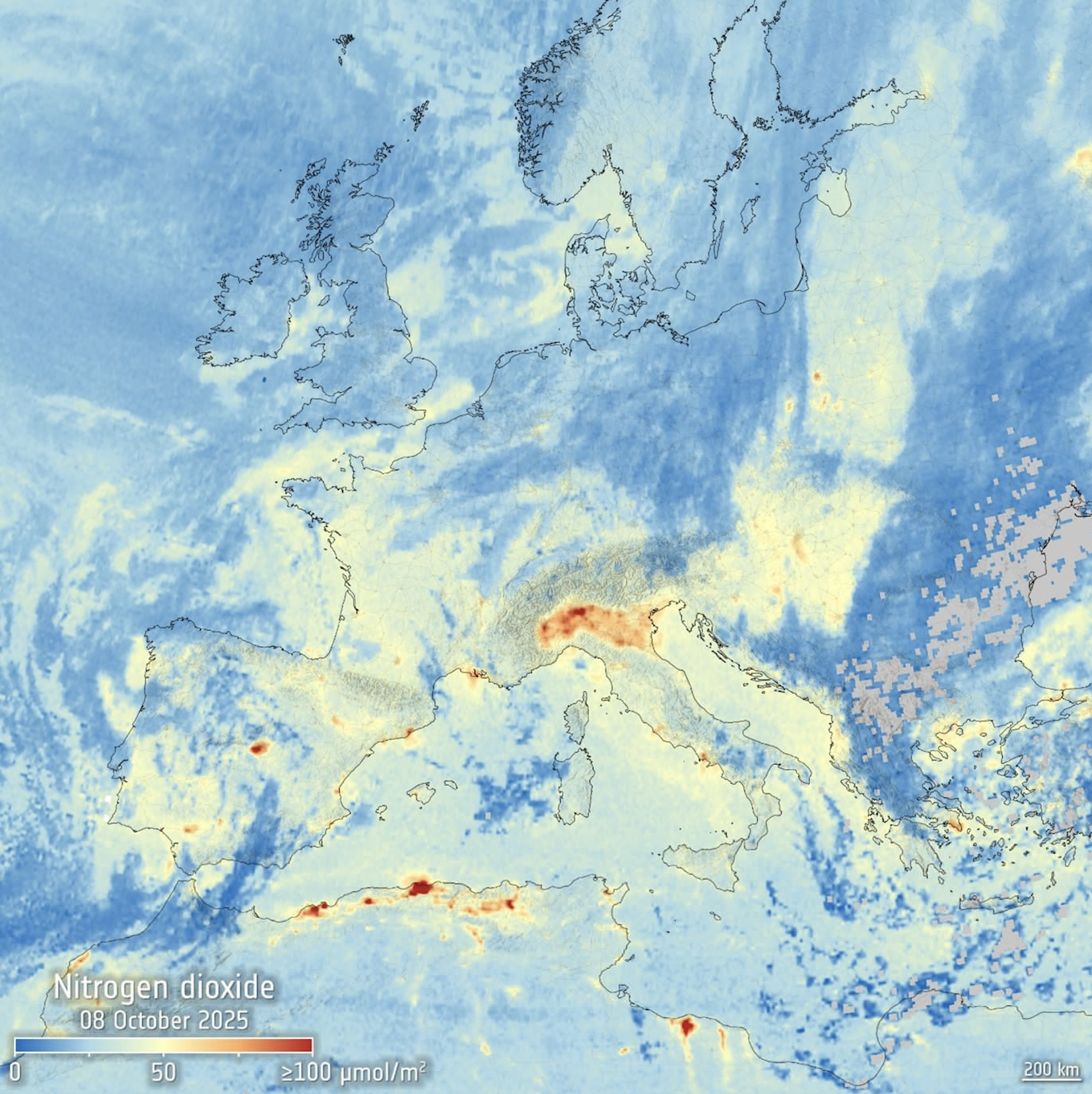 Εικόνα 1. Συγκεντρώσεις του διοξειδίου του αζώτου στην τροπόσφαιρα πάνω από την Ευρώπη, όπως παρατηρήθηκαν από τον Copernicus Sentinel-4 στις 8 Οκτωβρίου 2025.