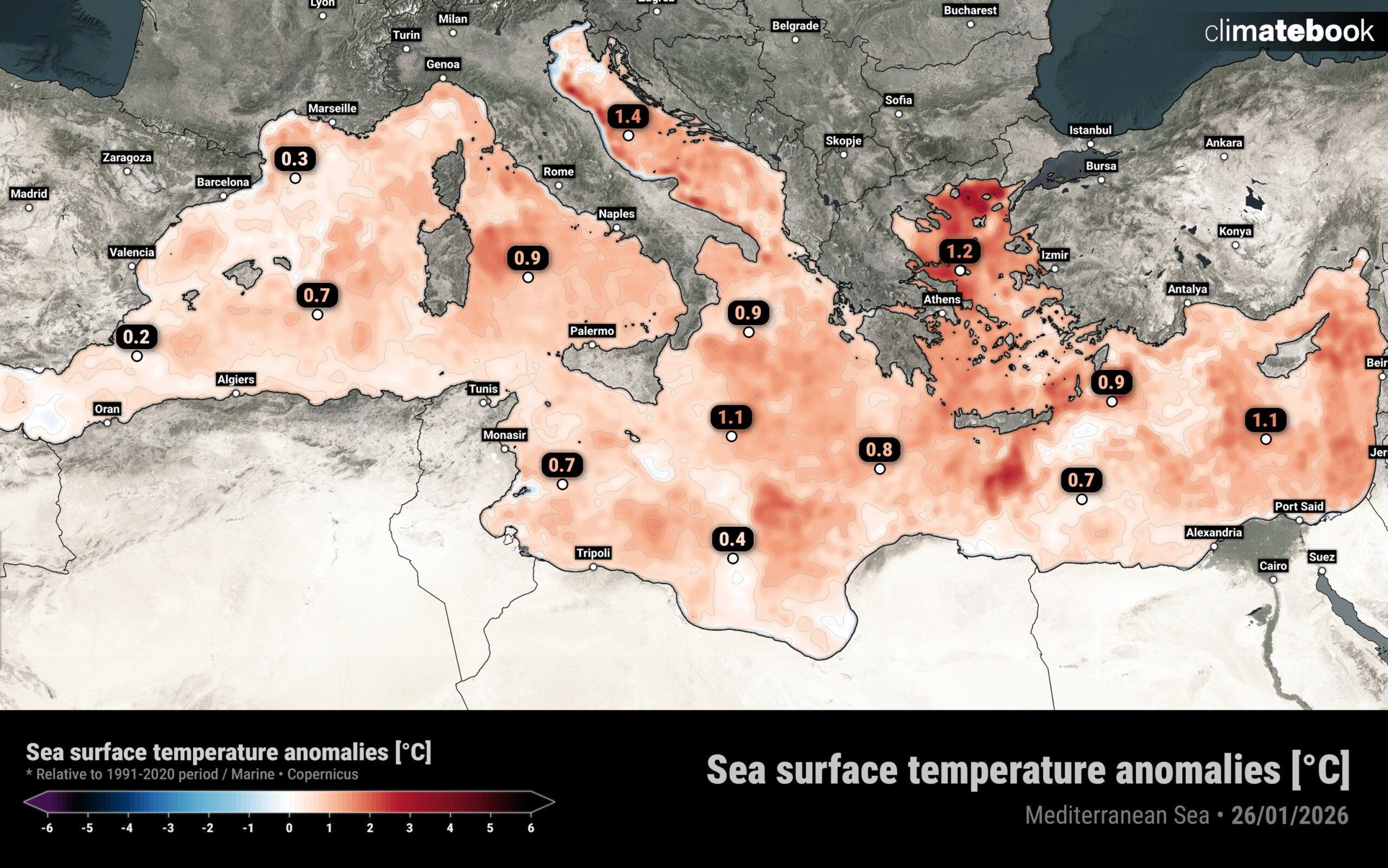 Την τελευταία εβδομάδα του Ιανουαρίου (26/1/2026) η επιφανειακή θερμοκρασία της θάλασσας παρουσιάζει μικρές θετικές αποκλίσεις στο σύνολο σχεδόν της λεκάνης της Μεσογείου, της τάξεως των 0.2 – 1.1°C σε σχέση με τη περίοδο 1991-2020 (Εικόνα 1). Το βόρειο Αιγαίο και η Αδριατική ωστόσο παρουσιάζουν συγκριτικά υψηλότερες τιμές (1.2 – 1.4 °C). Οι σχετικά υψηλές θερμοκρασίες αυτές αποτελούν συνέχεια της ανοδικής τάσης που παρατηρείται στην μέση θερμοκρασία της Μεσογείου απο την αρχή της νέας χρονιάς, σύμφωνα με δορυφορικές μετρήσεις (Εικόνα 2).