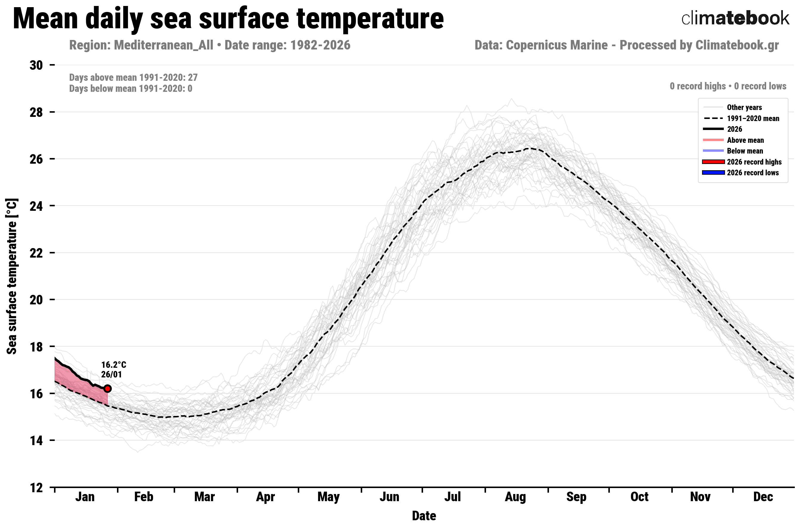 Θερμοκρασία της Μεσογείου θάλασσας τον Ιανουάριο του 2026