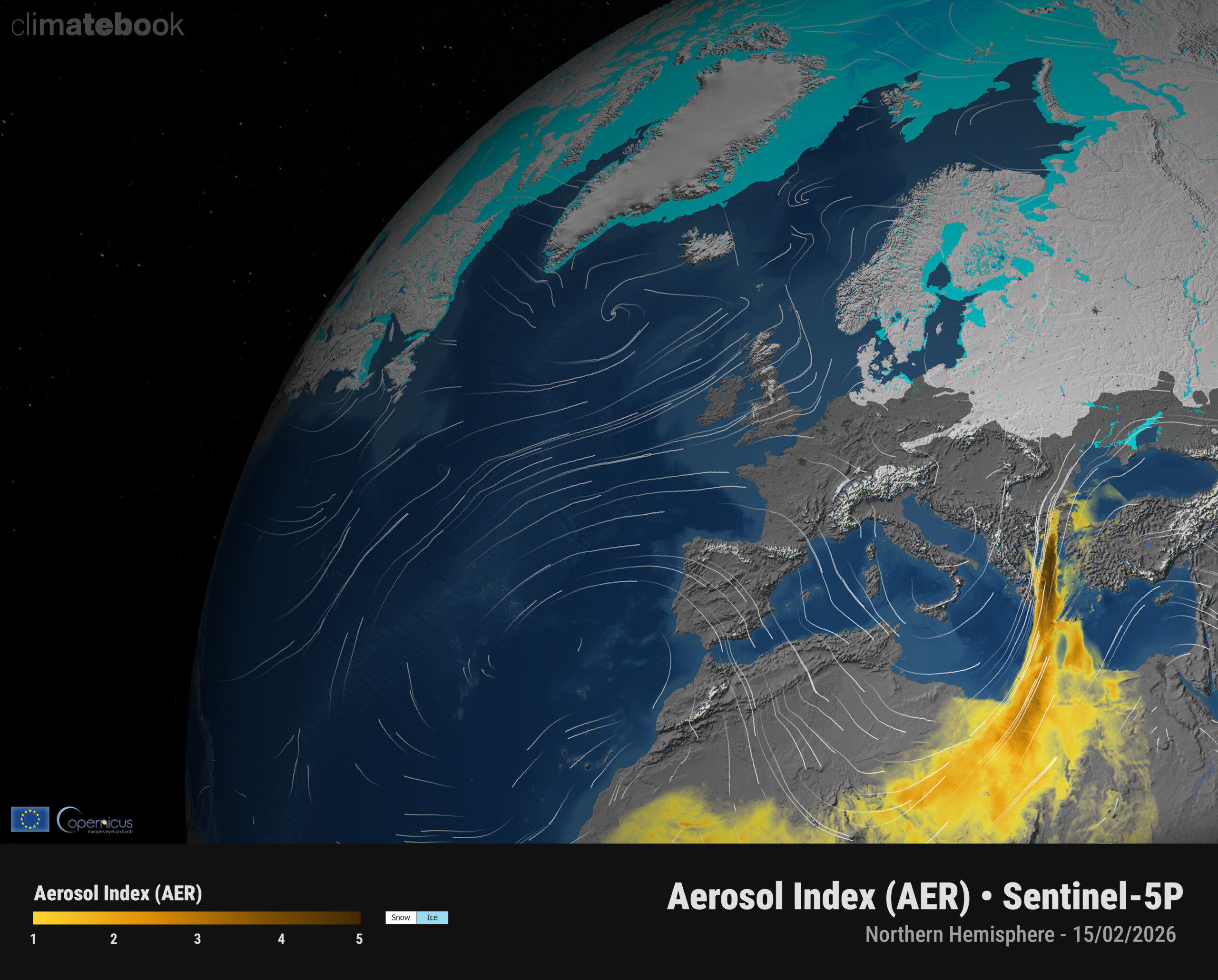 Υψηλές τιμές AER υποδηλώνουν αυξημένες συγκεντρώσεις απορροφητικών αερολυμάτων στην ατμόσφαιρα, αποτυπώνοντας καθαρά το επεισόδιο μεταφοράς αφρικανικής σκόνης και την πορεία της από τη Σαχάρα έως τα Βαλκάνια, το οποίο επηρέασε την Ελλάδα το Σαββατοκύριακο 14–15/02/2026.