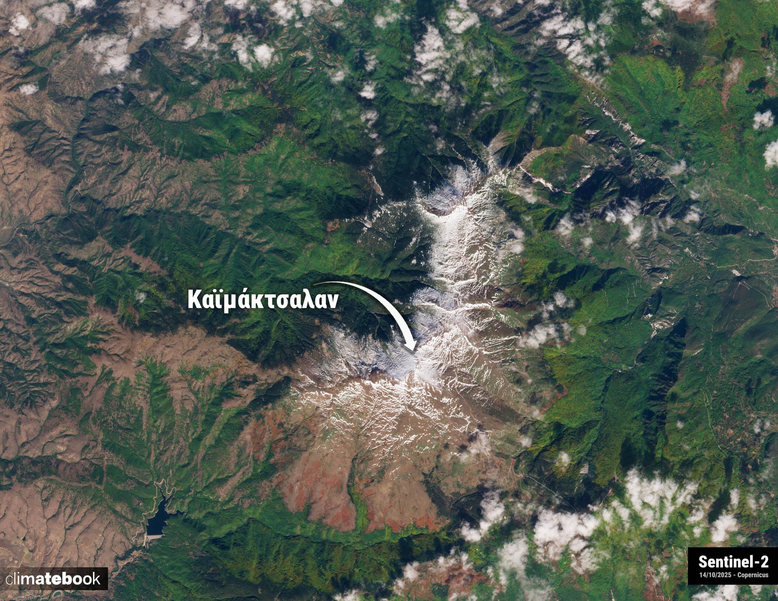Εικόνα 2. Δορυφορική εικόνα του ορεινού όγκου του Καϊμάκτσαλαν από τον δορυφόρο Sentinel-2 το μεσημέρι της Τρίτης 14/10/2025. Πηγή δεδομένων: Sentinel-2/Copernicus. Επεξεργασία & οπτικοποίηση: climatebook.gr.