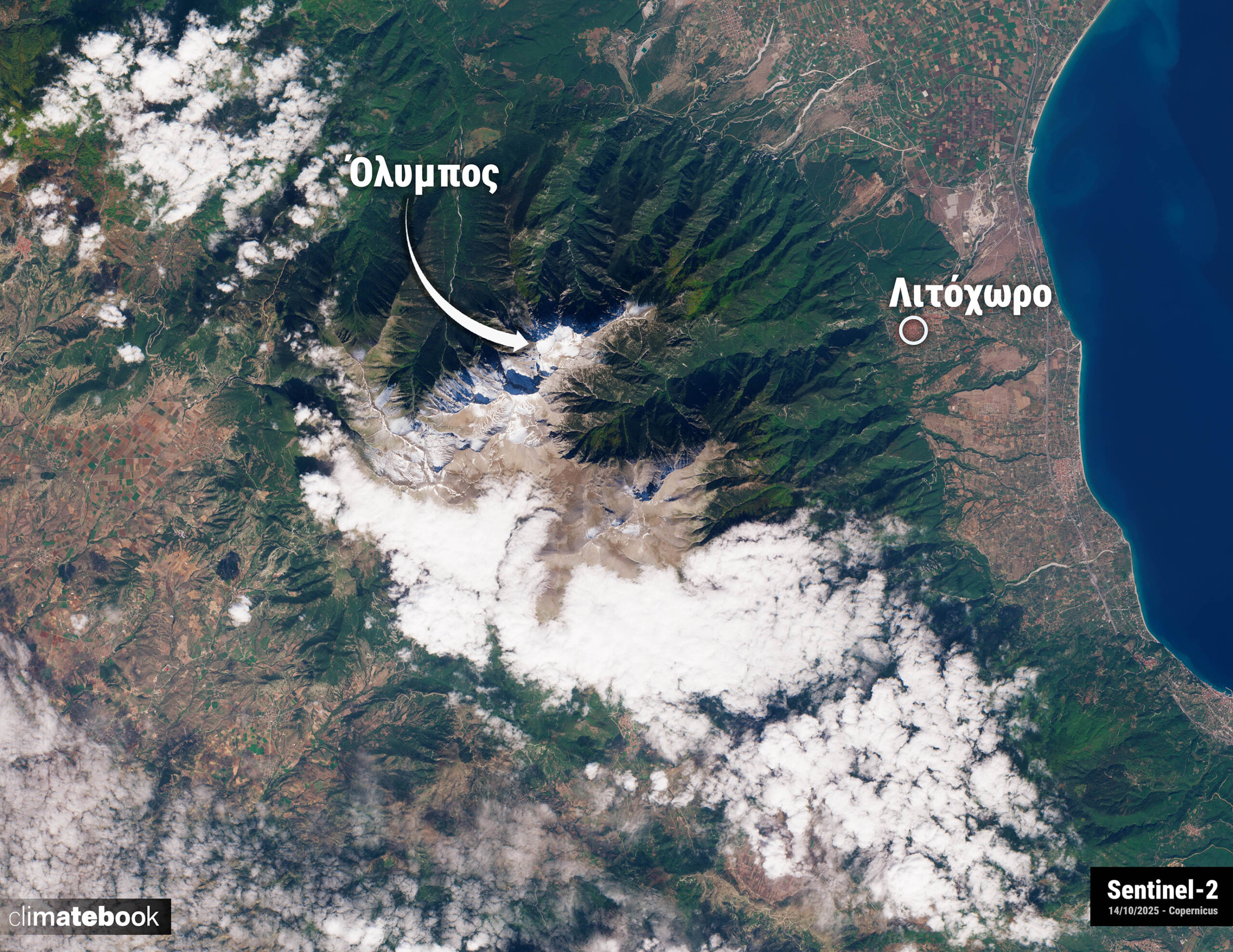 Εικόνα 3. Δορυφορική εικόνα από τον Όλυμπο από τον δορυφόρο Sentinel-2 το μεσημέρι της Τρίτης 14/10/2025. Πηγή δεδομένων: Sentinel-2/Copernicus. Επεξεργασία & οπτικοποίηση: climatebook.gr.