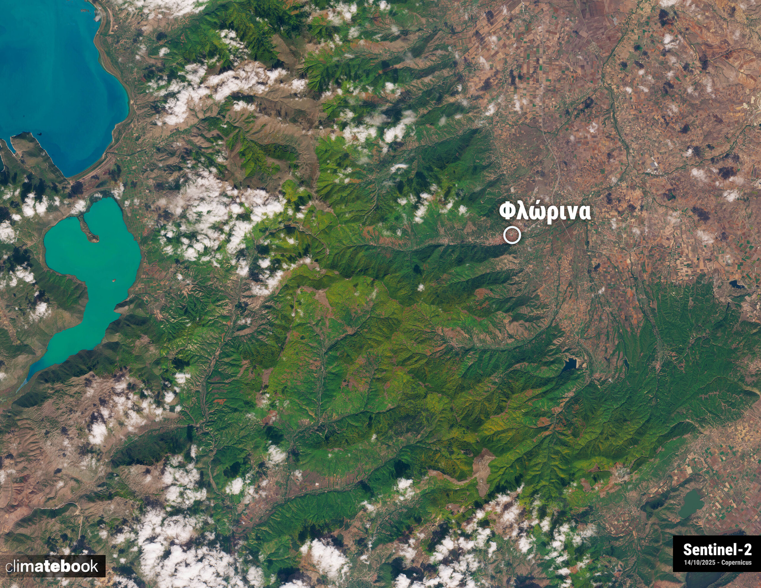Εικόνα 1. Δορυφορική εικόνα του ορεινού όγκου του Βαρνούντα στην περιοχή της Φλώρινας από τον δορυφόρο Sentinel-2 το μεσημέρι της Τρίτης 14/10/2025. Πηγή δεδομένων: Sentinel-2/Copernicus. Επεξεργασία & οπτικοποίηση: climatebook.gr.